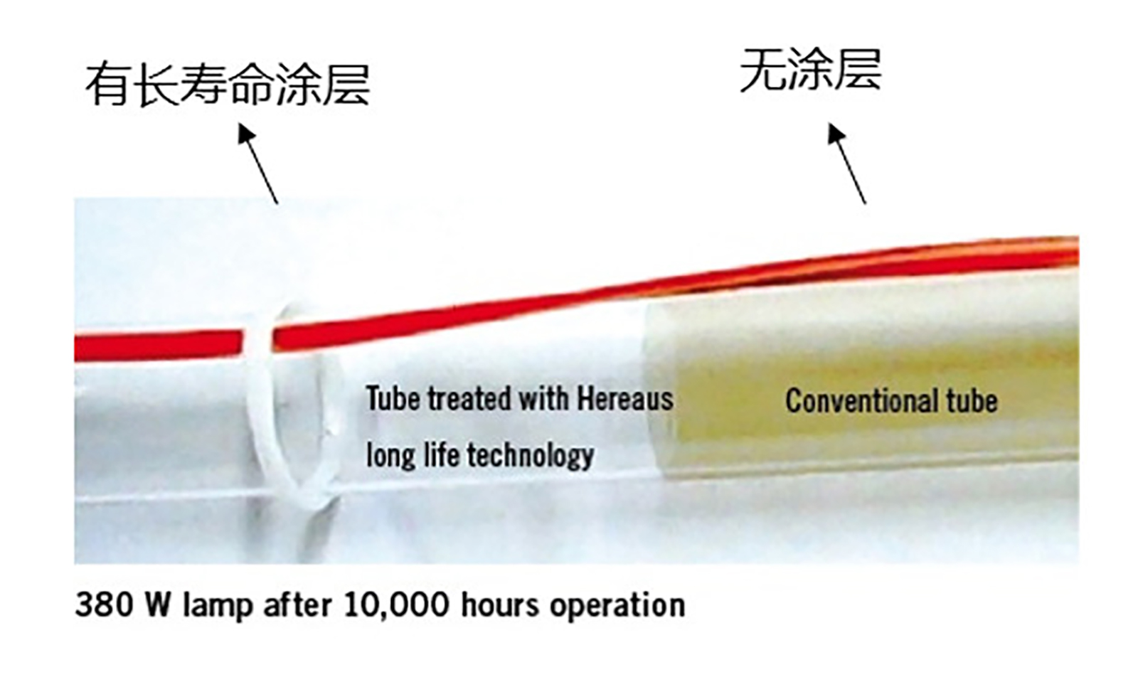 Figure: The same UV lamp produced by Heraeus. The left half uses long-life materials, while the right half only uses high-purity quartz and does not use long-life materials.