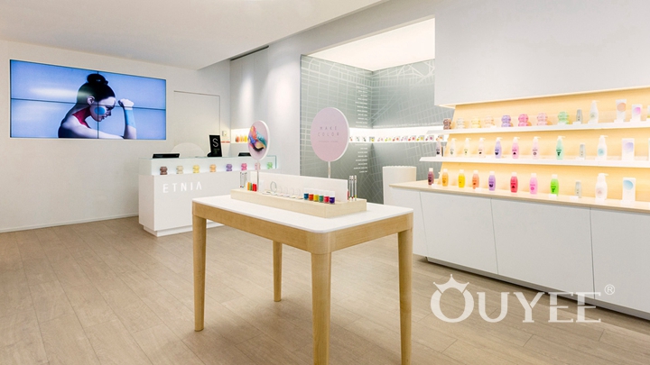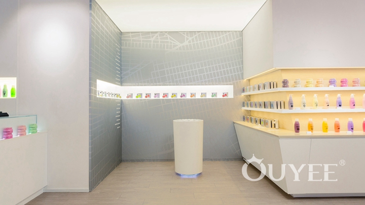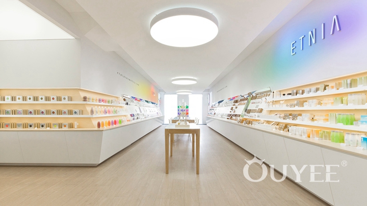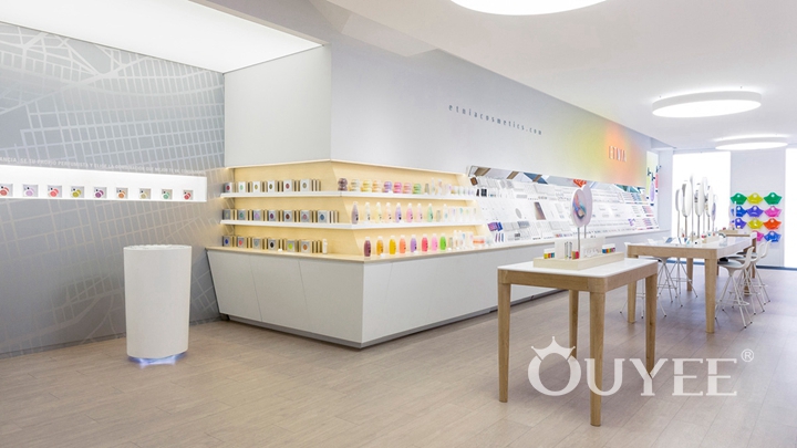 The design of the whole shop looks simple but delicate, its light-colored theme tone gives people a sense of elegance and health, which highlights the core of this makeup brand. Connecting the ceiling to the floor, the full-height wall display looks quite big and heavy than normal, accommodated exquisite cosmetic products together to form a strong contrast. In addition to the full-height wall displays on both sides, several makeup test tables are specially placed in the middle of the store for customers to try cosmetic, bringing better product experience and service experience to customers, which is absolutely a good idea for marketing.
