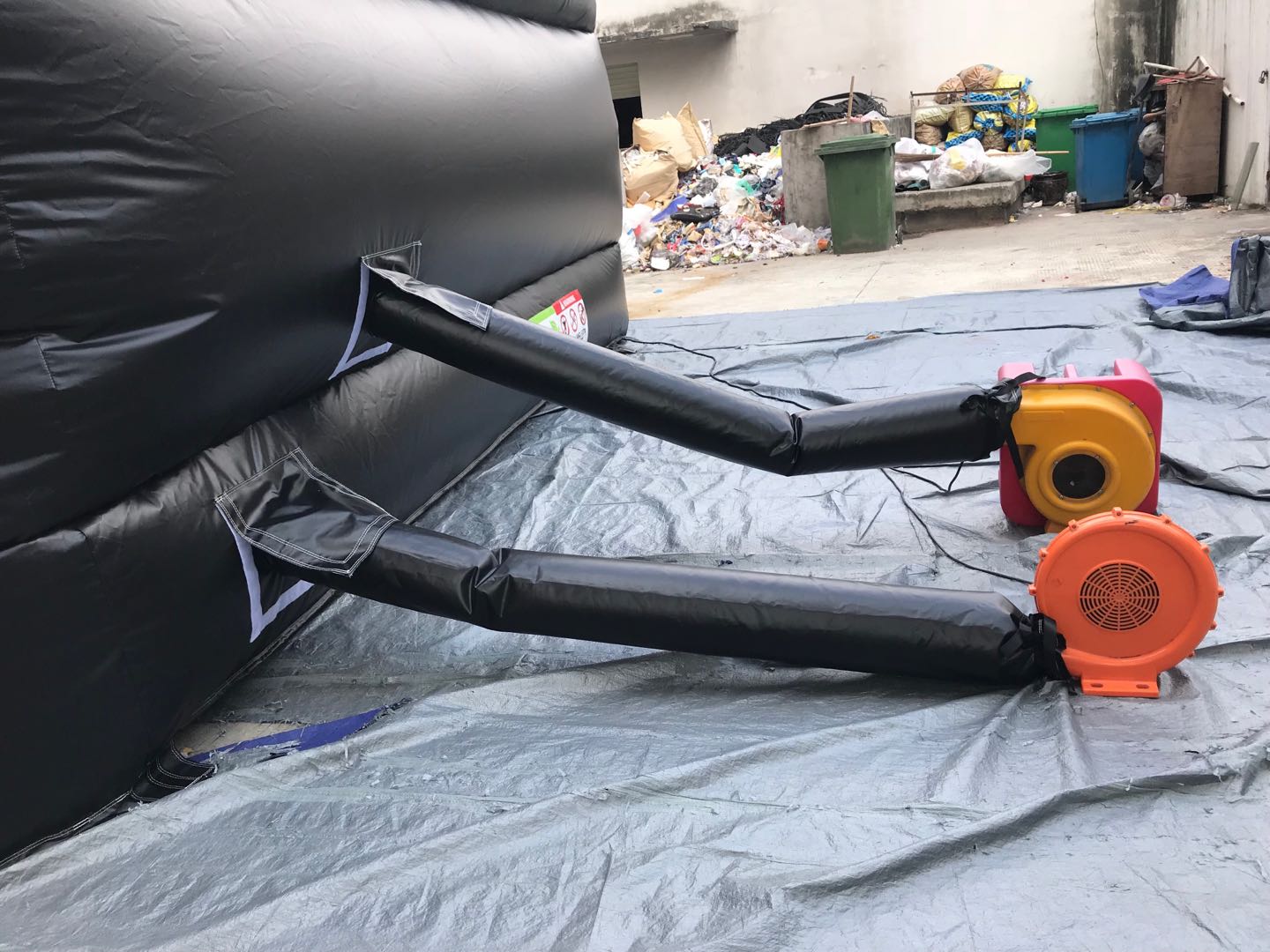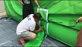 1)Place and stretch the protective fabric. Then put the inflatable revolution air bag on it. Expand the air bag and make it flat enough,which makes the inflation goes smoothly.