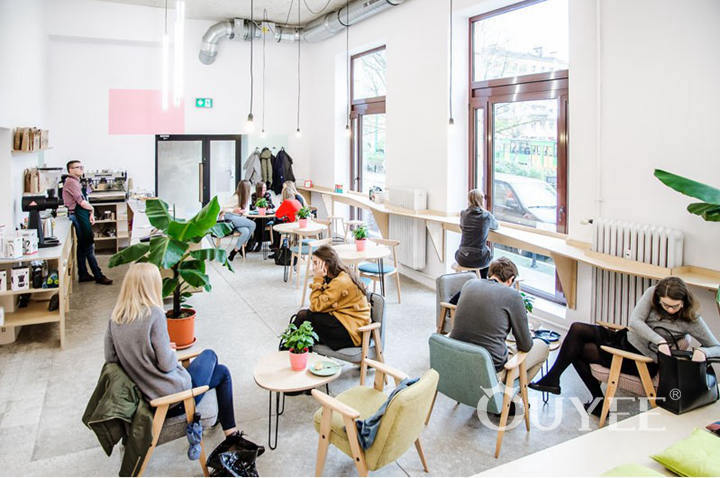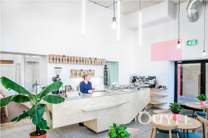 Greeting customers as they walk in, is a large service counter with floating shelves off to one side, and an open seating area on the other. Coffee counter finished with beige marble surface to make it looks stylish and match with whole shop’s color tone. For make customers easy, a baffle was be installed in front of the counter to facilitate the customer to put their bags and other stuff when order.