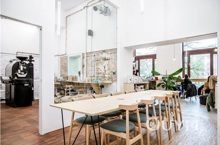 Located off the main open area of the coffee shop is an area for meetings or workshops. A large wooden table surrounded by chairs provides plenty of space for a small group of people who also want some privacy.