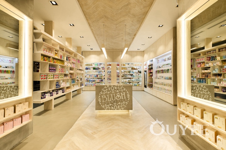 The simple and practical wooden display rack are placed with products fully. LED lights are added on the edge of the showcase to allow customers to view the details of products much more clearly. The bottom of the wooden cosmetics counter is also equipped with LED lights. The soft lights are scattered from the bottom of the counters, looks hazy, just like the fog, adding more to the cosmetics store's mystery.