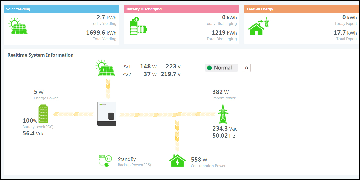How many kWh battery required is depends on the total load power and back-up hours. For example, the required back-up hours is 5 hours, and total load power 2KW, 10kWh battery will be ok