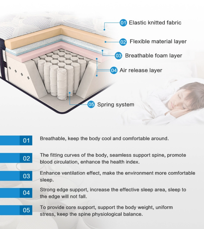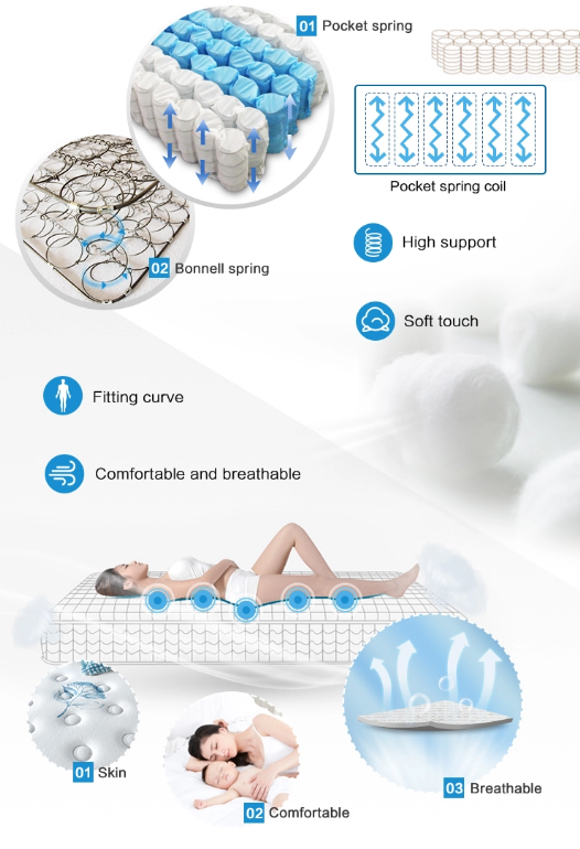 The independent spring mattresses are made of high-quality spring steel wire and wound into a "independent barrel shape". They are sealed in a non-woven bag through a compression process, which has good air permeability and can effectively avoid the noise generated by the friction between mold, insects and springs.