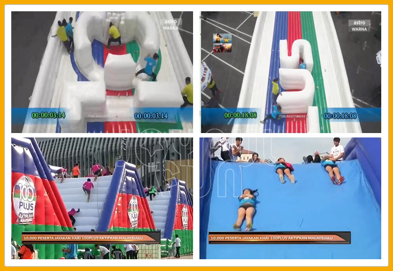 We JOYFUL FUN provide a variety of inflatable products for the event, such as super inflatable obstacle course,inflatable arch, inflatable logo obstacle, big balls and so on. The whole process, it mainly combine with inflatable products, a sports drink and various games to form a project, each place put different functions of the product, and the participants divided into team red, orange and blue, then the highest score win the competition. By all games, players can really experience the fun of participating in this event, meantime, also exercising their teamwork and coordination skills.