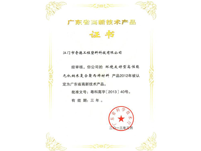 March 2, 2013, the Guangdong Provincial Science and Technology Department to Kitech Engineering Plastics Co., Ltd. came good news: Kitech technology independently developed by the "environment-friendly high-performance inorganic nanocomposite Poly Propylene material" was identified as "Guangdong Province High-tech products "(approval Number: Guangdong Hi-Tech Zi [2013] No. 40), the product through the processing of inorganic nano-materials, and through a special process composite technology, product upgrades Kitech has a technology innovation to make, become the vanguard of one of the provincial science and technology enterprises, and use the fact that once again proved that the "national high-tech enterprise," the extraordinary strength.
