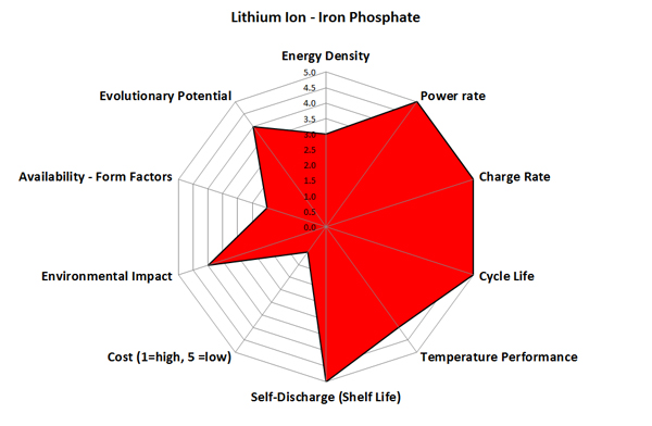 Energy density – A compounded effect of lower nominal voltage and chemical energy density give the chemistry a 40% to 60% lower energy density versus cobalt oxide cells which means that more cells are required which increases volume, weight and cost.