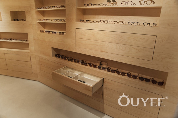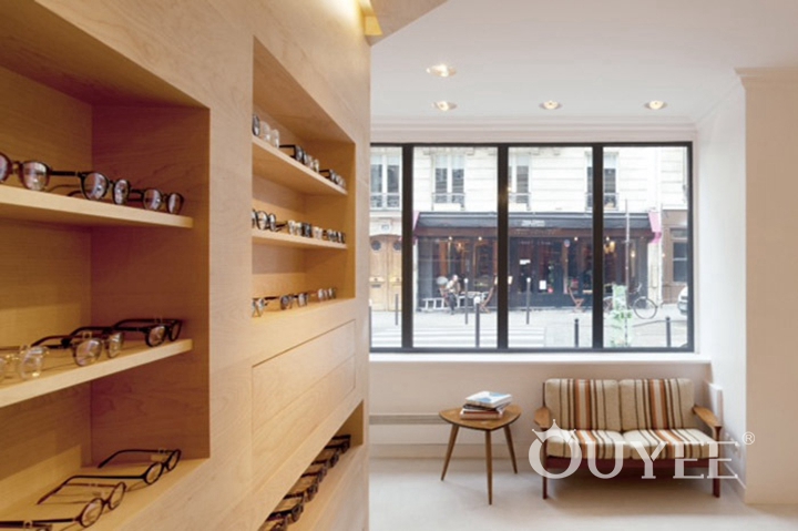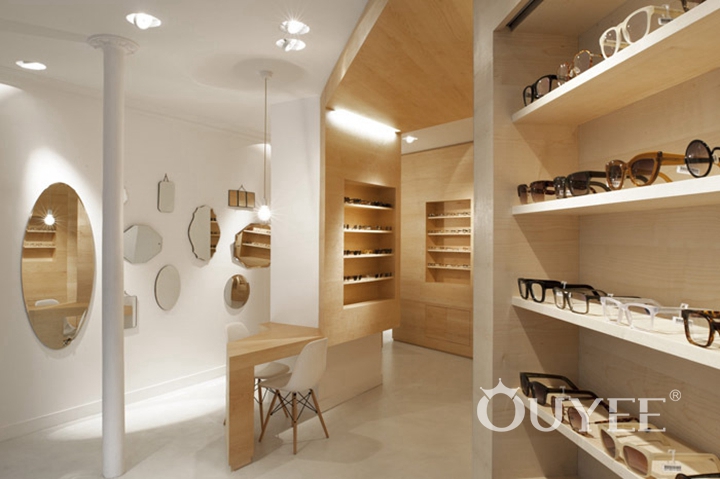 Designer use white and wood color, and abandon the messy and fancy decoration to make the whole space look clean and bright. So that customer's main attention can always focus on the glasses and try to use them. It is pretty important for a place which are selling optical.