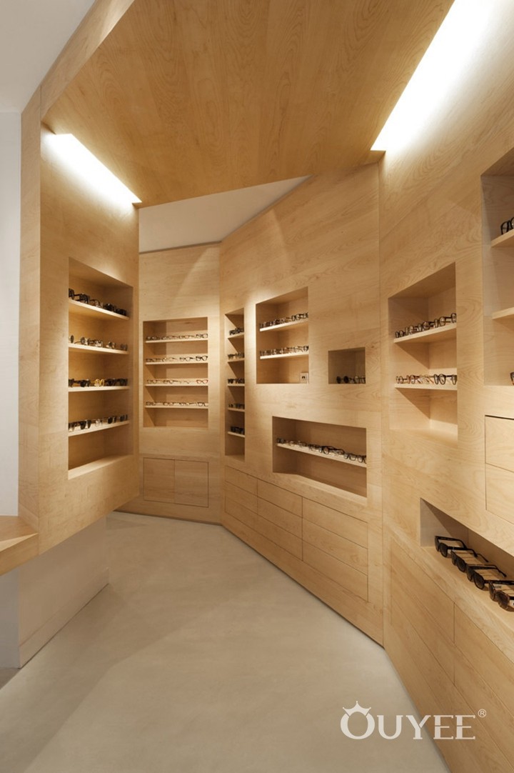 In order to maximize space use, a sloping wall was fitted with wood optical display cabinet according to undulating folds. Meanwhile it create a rough and refined space for whole shop.