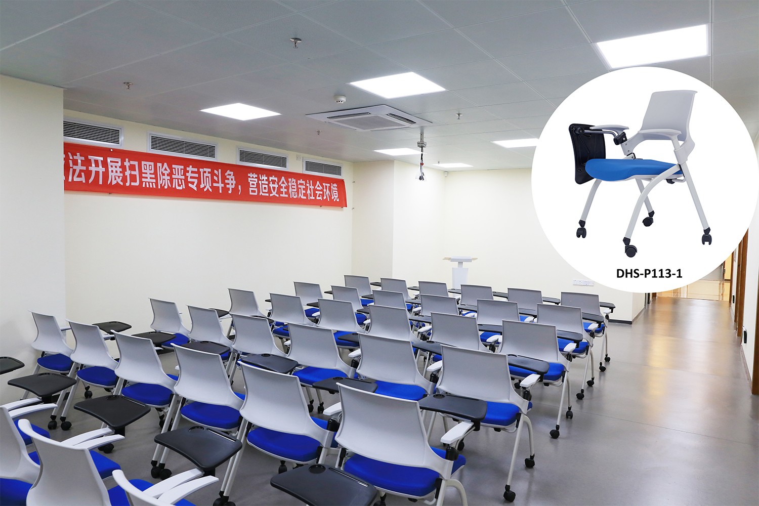 These are our mobile training chairs with writing tablet (model no. DHS-P113-1). Ergonomic plastic mid back design for upper back support. The foldable seat and flexible castors allow the mobility and space-saving come together. The seat pad is thick enough to provide comfort, release pressure and not easy deform after long time use. The tablet arm of this seating make it an ideal choice for learning environments. Also, there are optional back cushion and book basket for selection, it is widely used in schools and training rooms etc for providing a convenient environment.