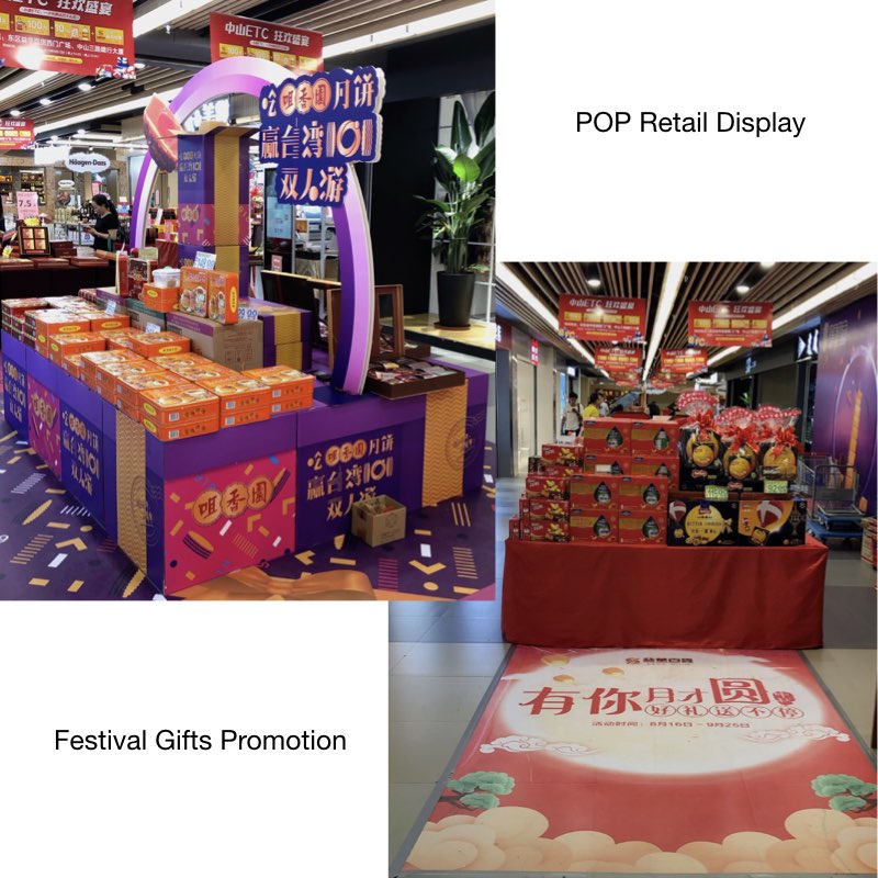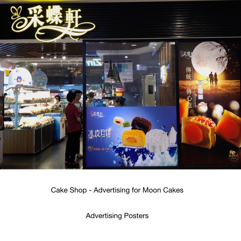 Gifts are usually given in advance, so around two days before the Mid-Autumn festival, many shopping malls and supermarkets remove mooncakes from their shelves. Look at these pictures and you will know what advertising props are included in the holiday promotion, such as eye-catching window posters, hanging billboards and so on.