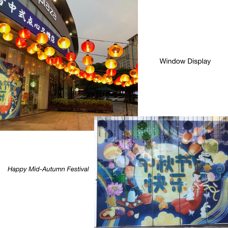 Some large shopping centers have Mid-Autumn festival scene props. Such as lantern decoration, with large posters on the window, such decoration has a special atmosphere at night.