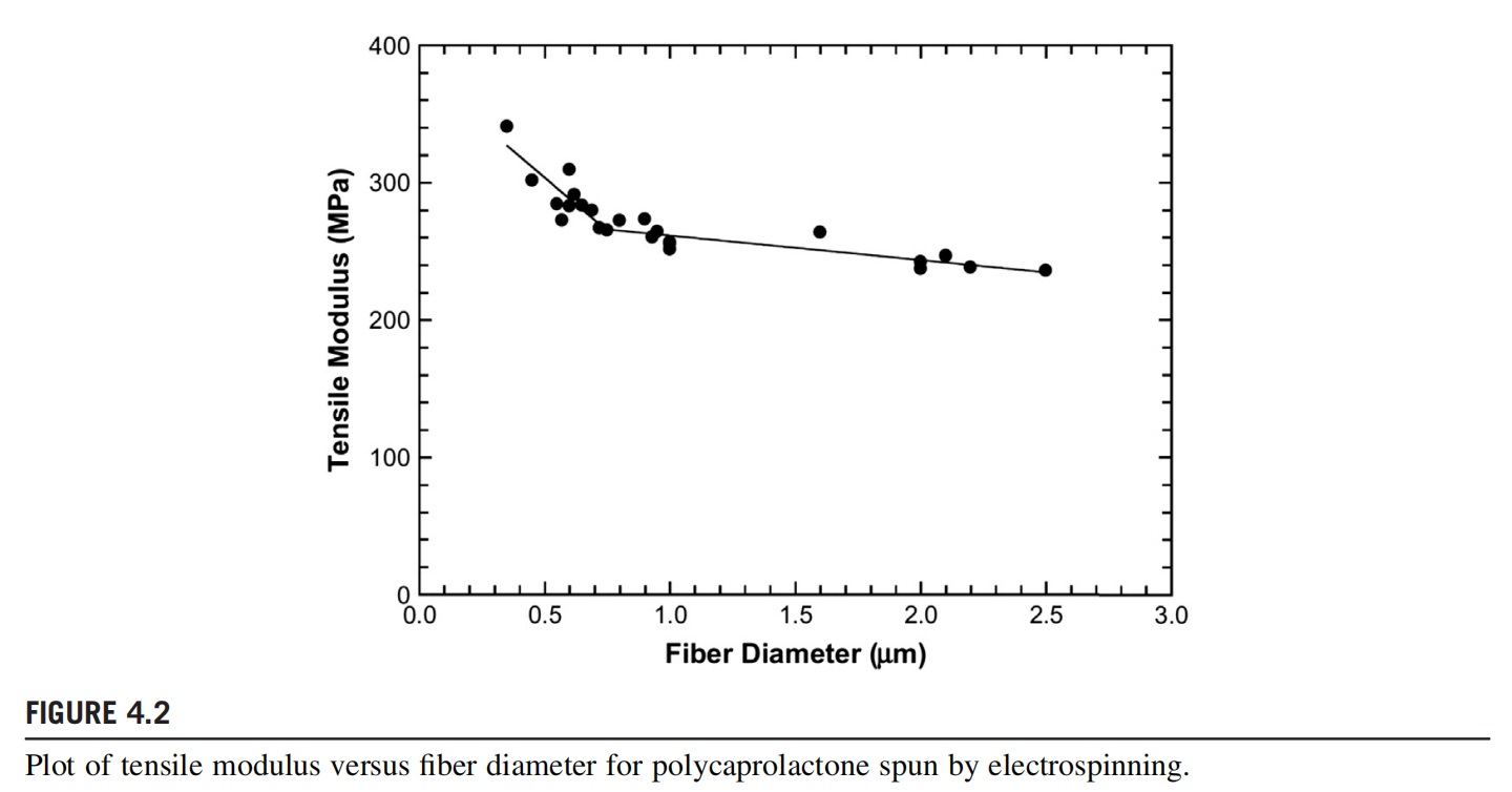 Hierarchal complex structures with small dimensions can provide advantages over larger dimensions at several occasions, owing to the increased surface area. One such example is the artificial scaffolds for tissue engineering mimicking ECM. The cells binding to scaffolds with microscale architectures flatten and spread as if cultured on flat surfaces. This might be different for some exceptional cells. The scaffolds with nanoscale architectures have a bigger surface area for absorbing proteins and present more binding sites to cell membrane receptors. The adsorbed proteins can further change the conformation, exposing additional binding sites, which is expected to provide an edge over microscale architectures for tissue generation applications. Other applications in which dimensions in the nanoscale improve performance are filtration and reinforcement in making composites. Air and liquid filtration is a physical phenomenon: particles of size larger than the average pore size at the surface are filtered (sieve effect). The filtration efficiency is dependent upon the pore size, which in turn depends upon the fiber diameter. The mean pore size is generally three to four times the size of the mean fiber diameter. This means the pore size is reduced upon decreasing the fiber diameter and, therefore, the efficiency of filtering the smaller particles increases. State-of-the-art filters contain thick (micrometer) fiber networks with big pores. During air purification, the particles get trapped in the depth of the state-of-the-art filters, thereby increasing the pressure drop with time and cleaning cycles. The problem is overcome by the use of nanofibers (100e200 nm fiber diameter). The thinner fibers also are stronger and provide more efficient improvement in mechanical properties (Fig. 4.2) when used as reinforcing filler, because of the large specific surface area increasing the interface bonding strength between the matrix and the filler (Wong et al., 2008). The mechanical properties improve for lower-diameter fibers, due to molecular orientation and increased crystallinity. These are some of the applications in which the effect of nano is very obvious.