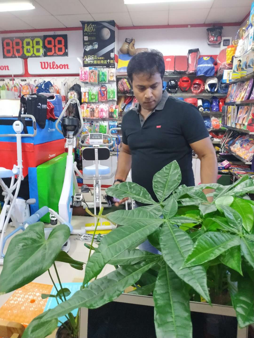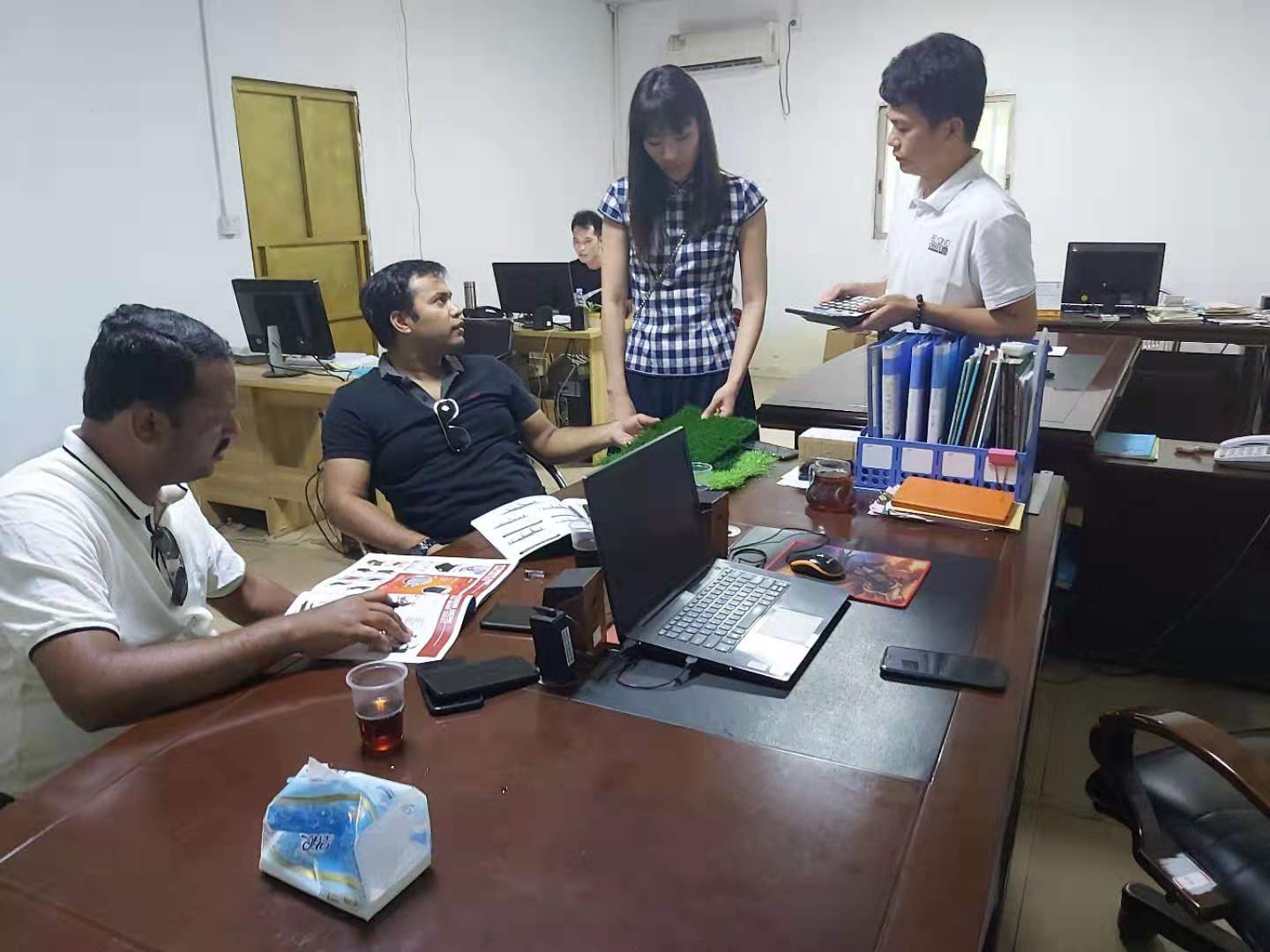 During the meeting, Wang patiently introduce the volleyball upright and badminton post to customers as well as the soccer gate which attracted customers mostly.