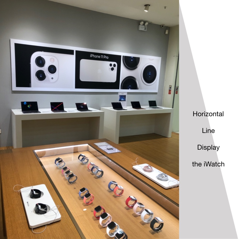 Now, let's go back to the main entrance to the best-selling iPhone column stand, behind it is the distinctive iWatch stand. The arrangement of products on iWatch's booth is arranged horizontally. On the top of the table, different styles of smart watches are placed on both the entrance and the back-to-door entrance. In the center of the table, there are glass cabinets that are embedded downwards, and iWatch with different straps is placed inside. It is also horizontally arranged so that users can compare different colors.
