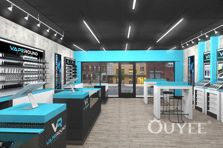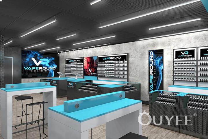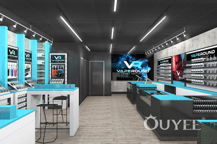 For the Vape Round shop in Canada, one of our new store designs, we envisioned a modern space, closer to one fit for a technology retailer. That meant clean lines, yet plenty of display cases and shelves, plus a well-organized vape shop design and well-thought layout that would allow the customers to easily slide from one display case to another and get the information they need