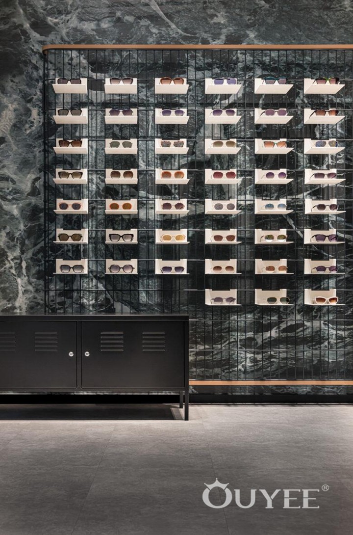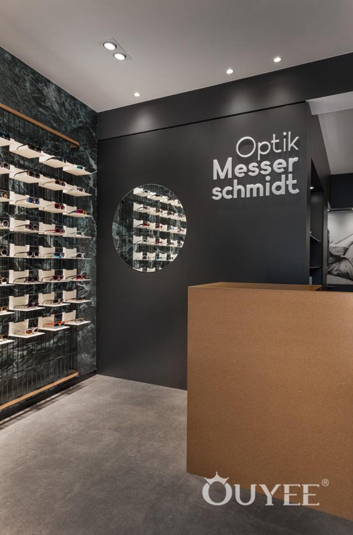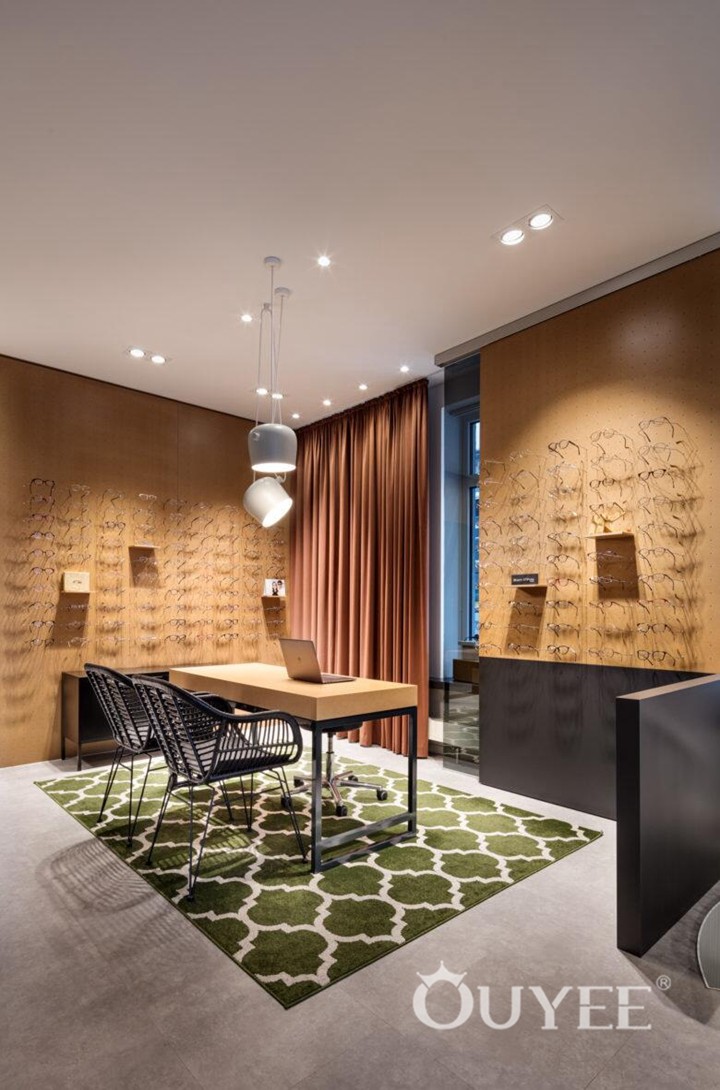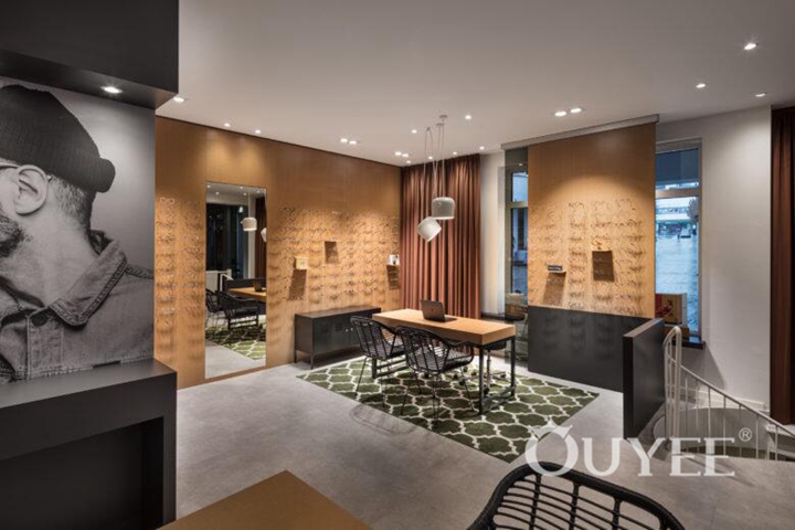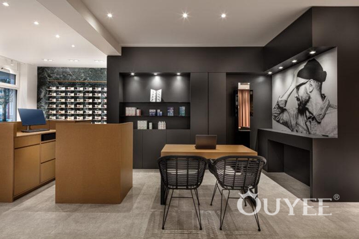 Men’s display space and consulting space are both small and the round corner inside could soften the irregular space. Display plates made of frosted glass are lightened by LED behind, which enable eyewear to stand out. Customized acrylic lighting provides general light for the core space, and helps set it apart.
