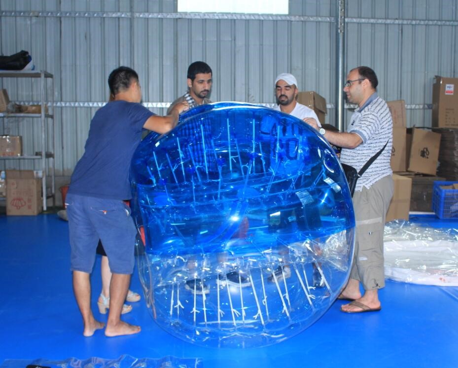 We firstly headed to the air-sealed inflatable testing area, and we had some inflatable bubble balls there that the clients can have a look and try to see the high quality of the balls! We also introduced the new details that we adopted into the production which will make the products much more durable with smaller packing sizes! And the clients were all satisfied with the details that we focused on to make the products better!