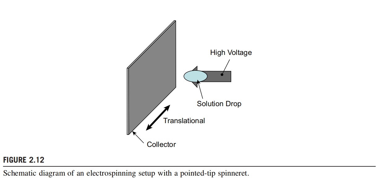 Using a pointed tip instead of a needle, Sun et al. (2006) reported a breakthrough in the electrospinning process. A schematic diagram of the pointed-tip spinneret is shown in Fig. 2.12. The group was able to form fine patterns using electrospinning by depositing fibers at the stable region of the electrospinning jet. The distance between the tip and the collector in this setup was less than 3 mm. To allow for the solidification of the fibers and the stretching of the jet to the nanometer diameter level, the solution source has to be sufficiently small. A tungsten tip of 25-mm tip diameter was used and the polymer solution was transferred to the tip by immersing and pulling the tungsten electrode in and out of the polymer solution. At a distance of 1 mm from the tip to the collector, a 1-kV voltage was sufficient to initiate the electrospinning process. Using a movable collector at a speed of 20 cm/s, straight-line nanofibers were constructed with resolution of up to 25 mm. However, this method shows its disadvantages. The small amount of polymer solution that can be spun at one time means that there is a limitation on the length and the production rate of the nanofiber that can be fabricated. Nevertheless, this method may still be useful in applications such as sensors or 1D polymer transistors where the fiber can be deposited over specific conducting electrodes.