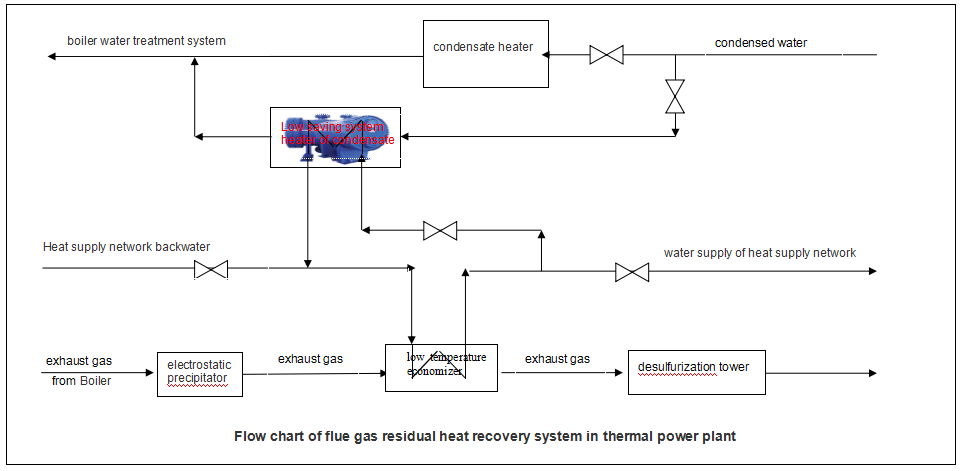 In summer, the flue gas generated by the thermal power plant is about 130~140 °C. The low-temperature economizer heats the 75 °C economizer closed circulating water to 115 °C, the flue gas temperature is reduced to about 110 °C, and the desulfurization system is entered. The 115 °C economizer closed circulating water uses a fully welded plate-and-shell condensate low-system heater to heat the 38 ° C condensate to 110 ° C, and then condensate into the boiler feed water treatment system. In winter, the boiler flue gas is heated by a low-temperature economizer to heat the 70°C heat network water, which is heated to 110 ° C, and transported to the distribution through the hot water supply pipe station.