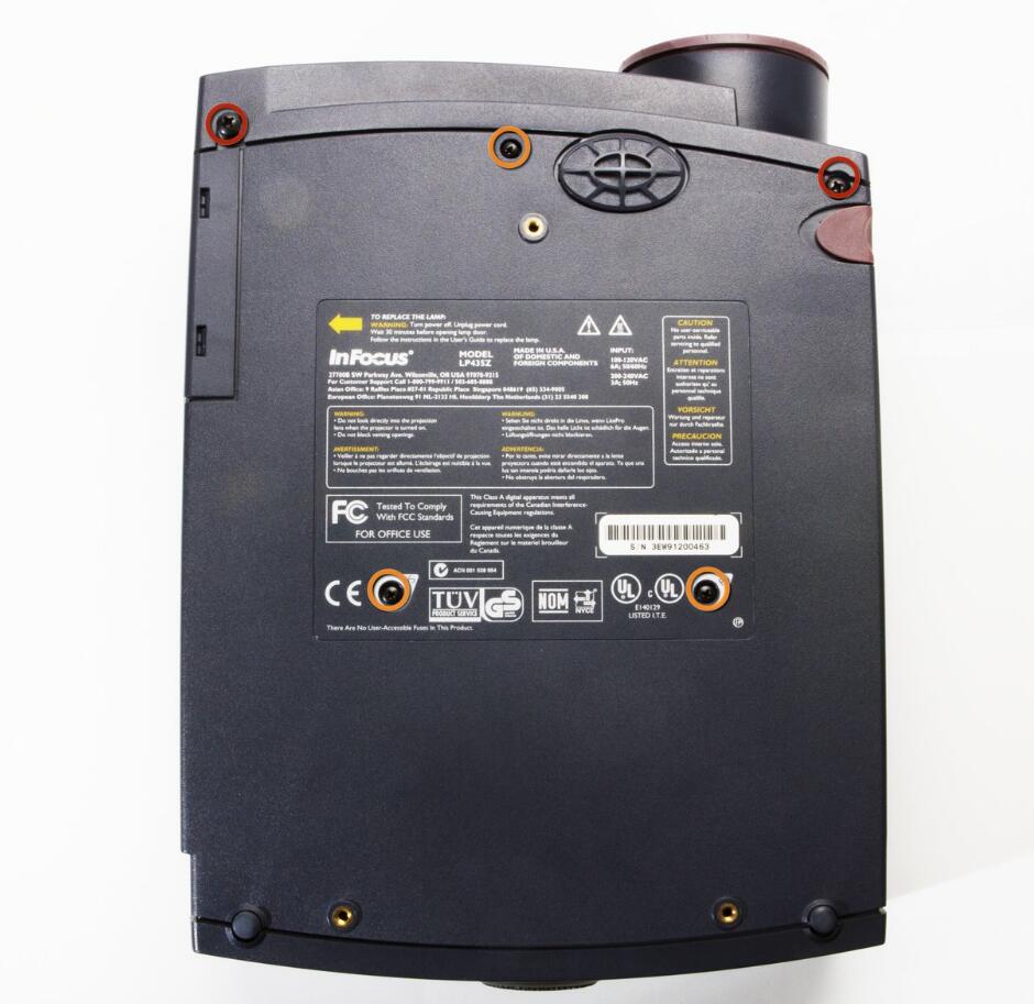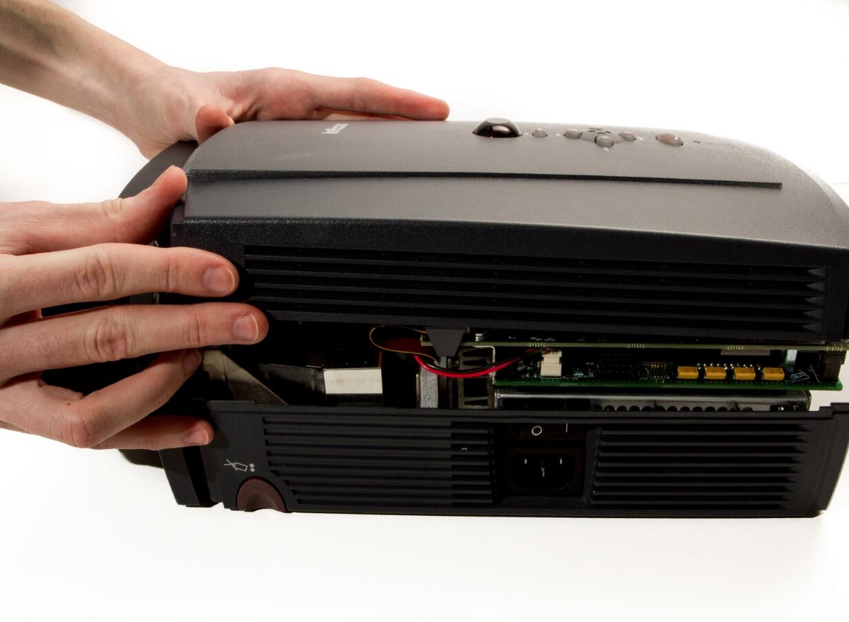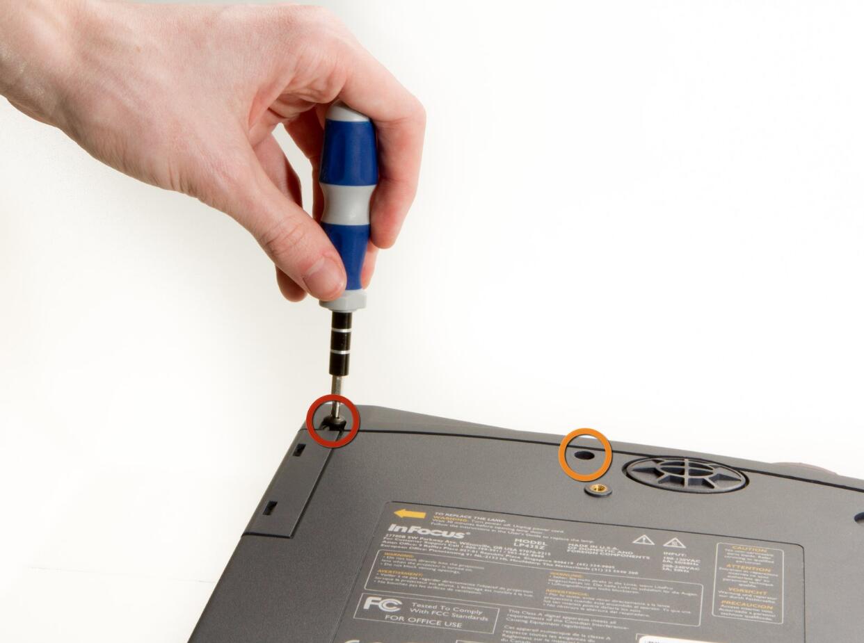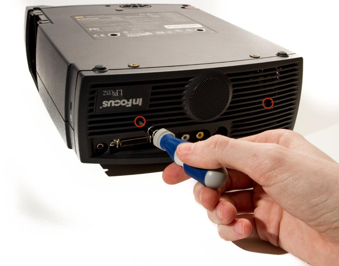 l Remove the two 8.5mm rear screws holding the rear case plate to the projector using the Phillips #1 screwdriver.