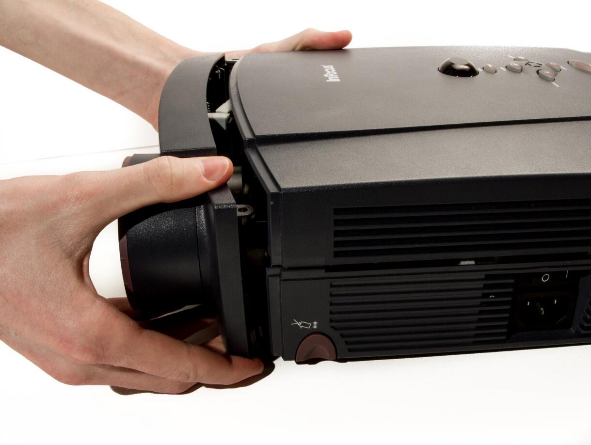 l Slide the front case plate towards the loosened zoom adjustment ring, until the top plate of the projector is freed from underneath the lip of the front case plate.