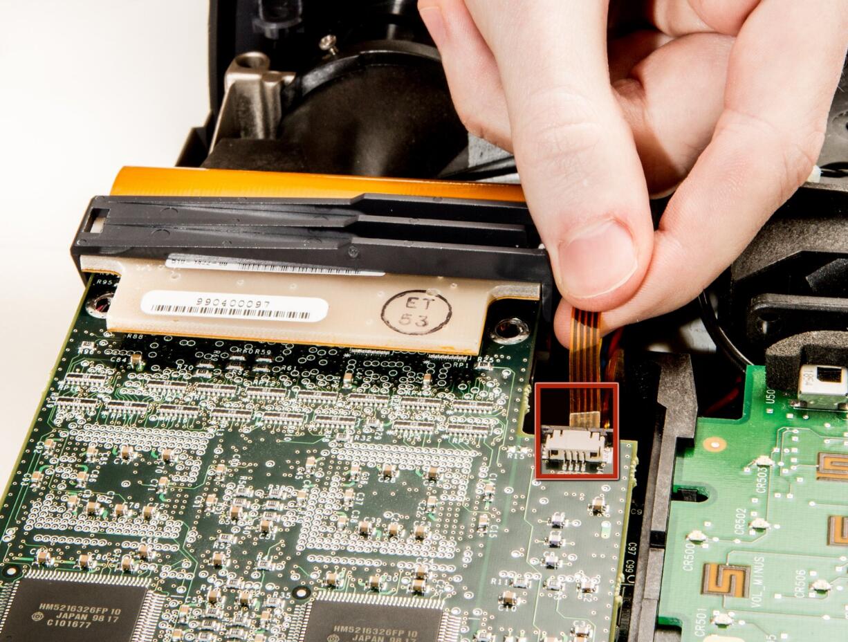 l Unplug the small ribbon cable attaching the DLP board to the motherboard.