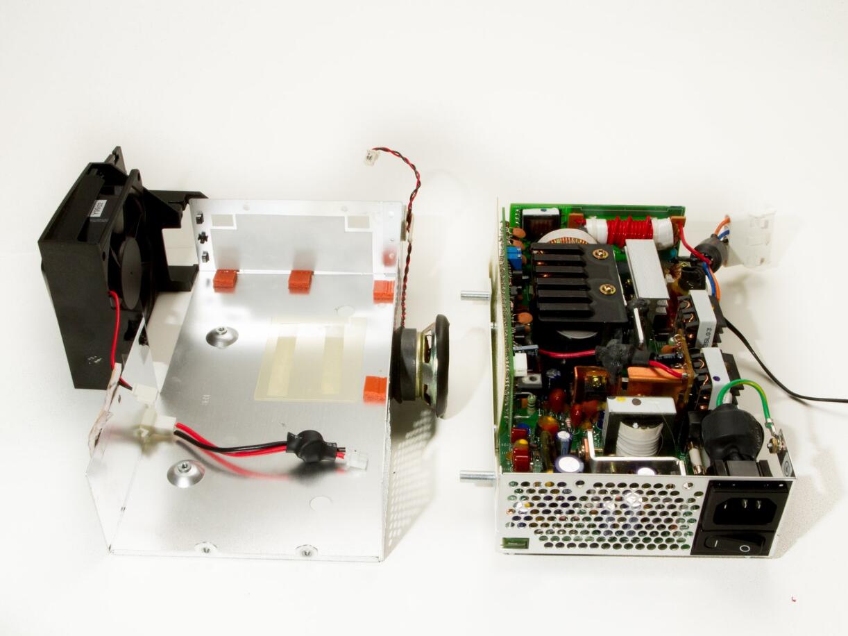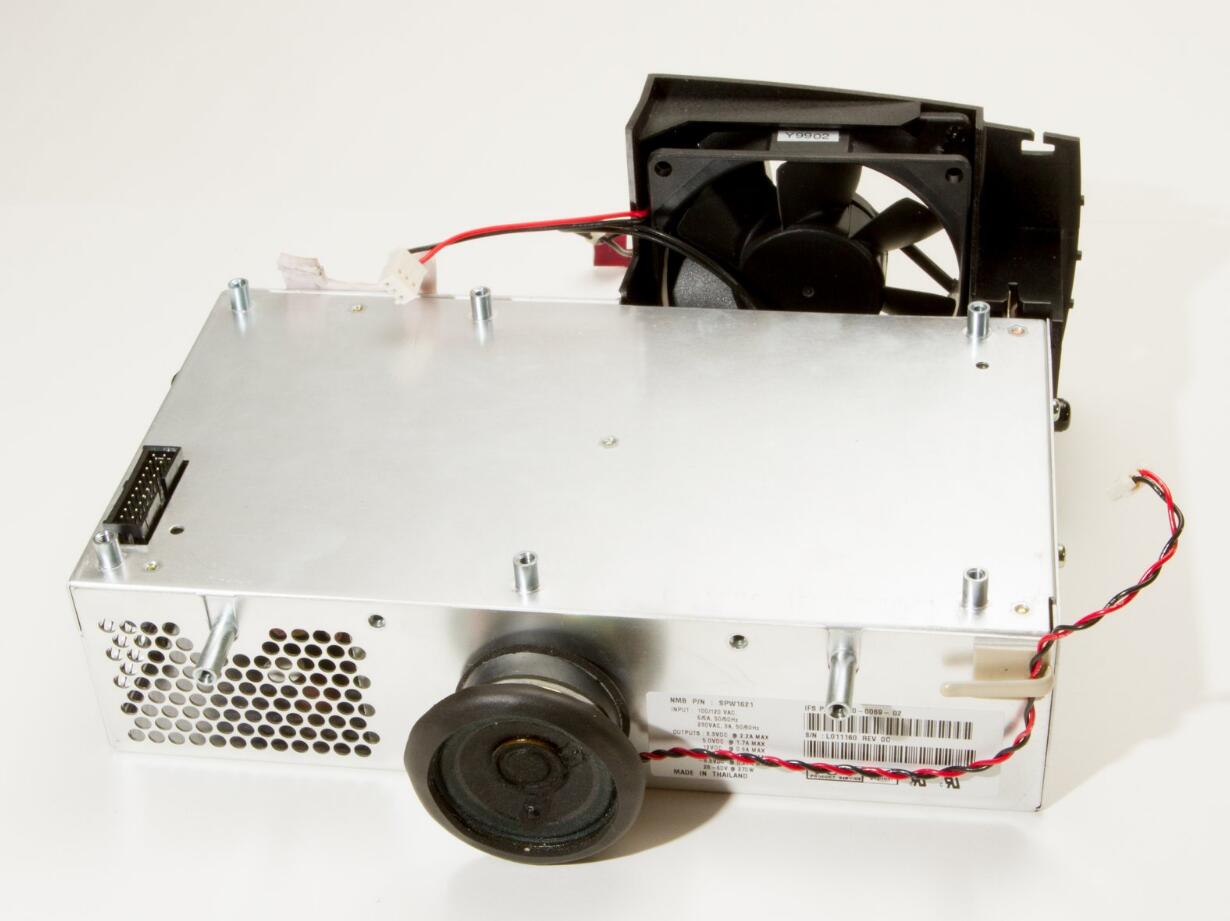 The power supply in this projector has an enclosure which the speaker and main fan are mounted on, and the base of the enclosure with the attached power supply can be removed and replaced.