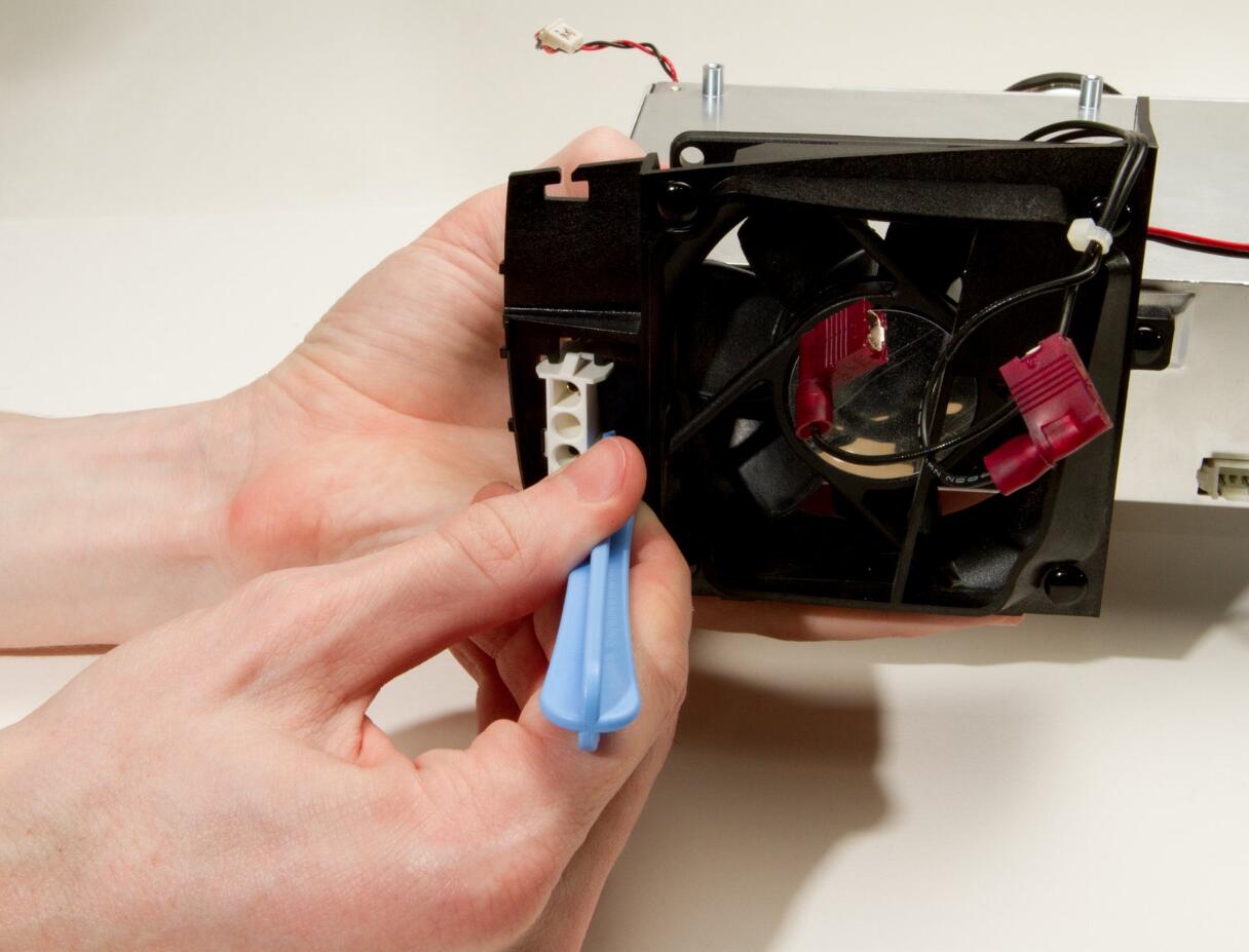 l Use a plastic prying tool to push the white molex connector through the fan enclosure.