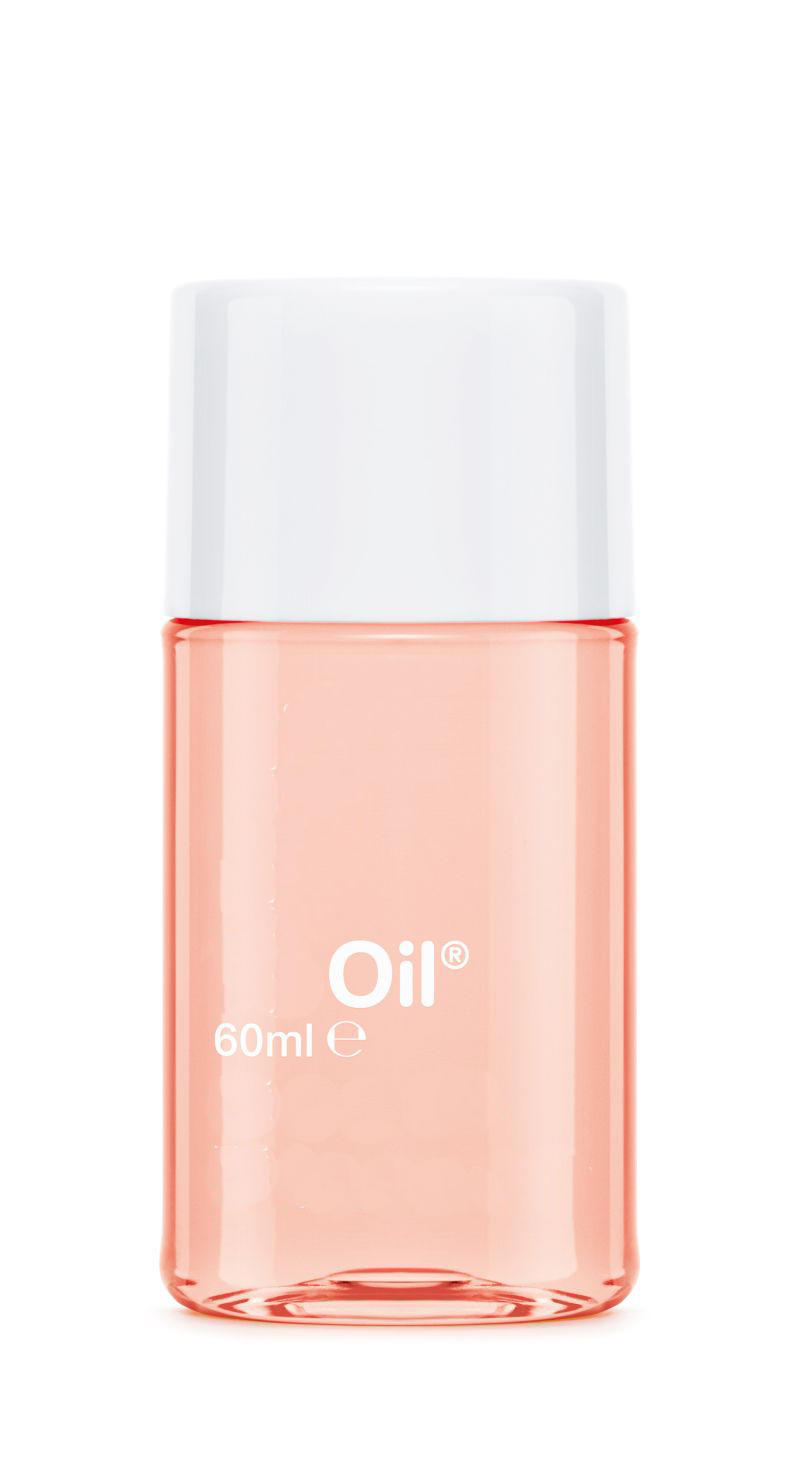 Clear plastic bottle of skincare oil.