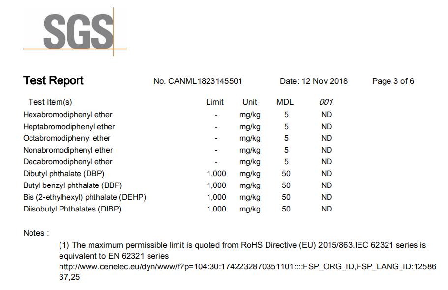 Cadmium(Cd),Lead(Pb),Mercury(Hg),Hexavalent Chromium(CrVl),Sum of PBBs,Monobromobiphenyl,Dibromobiphenyl,Tribromobiphenyl,Tetrabromobiphenyl,Pentabromobiphenyl,Hexabromobiphenyl,Heptabromobiphenyl,Octabromobiphenyl,Nonabromobiphenyl,Decabromobiphenyl,Sum of PBDEs,Monobromodiphenyl ether,Dibromodiphenyl ether,Tribromodiphenyl ether,Tetrabromodiphenyl ether,Pentabromodiphenyl ether,Hexabromodiphenyl ether,Heptabromodiphenyl ether,Octabromodiphenyl ether,Nonabromodiphenyl ether,Decabromodiphenyl ether,Dibutyl phthalate(DBP),Butyl benzyl phthalate(BBP),Bis (2-ethylhexyl) phthalate(DEHP),Diisobutyl Phthalates(DIBP).
