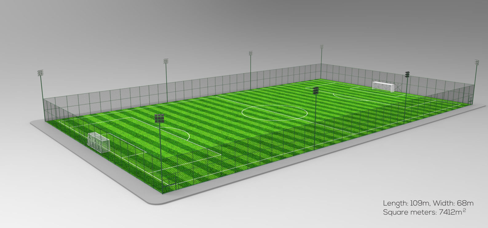 11v11 Football Court: Length:109meters Width:68meters Total Area:7412Sqm