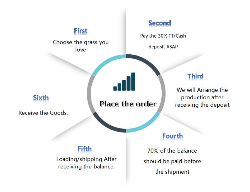 Choose the grass you love →Pay the 30% TT/Cash deposit ASAP→We will Arrange the production after receiving the deposit →70% of the balance should be paid before the shipment →Loading/shipping After receiving the balance→Receive the Goods.