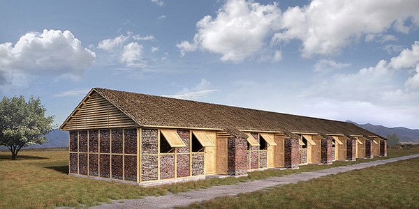 Ban’s design calls for 3-by-7-foot wooden frames, filled with rubble bricks. After securing a plastic sheet on top of the paper-tube roof truss (Ban’s signature material), people can simultaneously inhabit and build the structures by stacking additional bricks inside the frames.