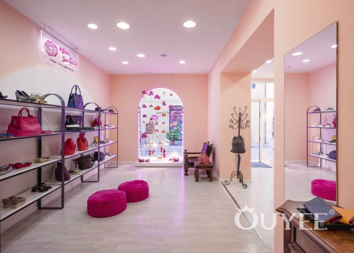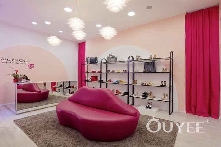 The interior walls feature plasterboard decorations with an arched form that echoes the shape of the streetfront openings. The footwear and accessories on display are all very special and colorful. To enhance the experience of the merchandise, the arches that form the backdrop for the wrought iron shelves have been painted white. The color peach suggests the fuzzy surface of the fruit, while fuchsia evokes the lipstick kiss logo.