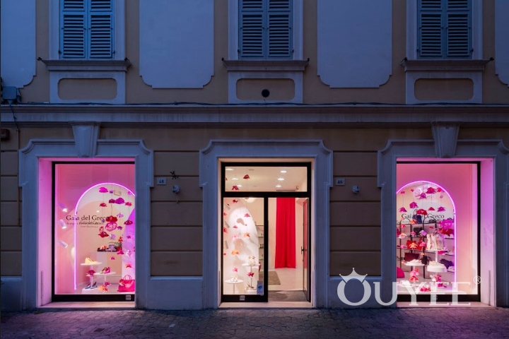 From the entrance visitors arrive in a room with a feminine touch of elegant taste, including Pop design citations from the 1970s like the pink neon of the display cases and the double fuchsia sofa that references the famous Bocca model by Studio 65 for Gufram. The choice of the sofa with the form of lips forms a link to the Gaia del Greco logo, the imprint of a kiss left with fuchsia lipstick. All the design choices, such as the range of colors, for example, respond to the need to create an environment that appeals to a female target, lovers of fashion who pay close attention to details.