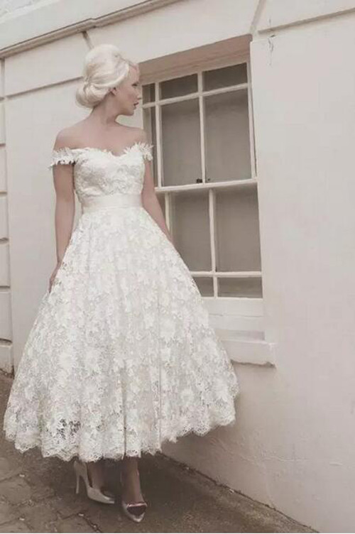 There is also a short wedding dress designed for the length of the calf or ankle. Although it is not as impactful as the long tail in appearance, it is the most elegant and graceful of all wedding dresses. Especially the following two, with a off-the-shoulder design, it feels like the bride is a nobleman from "Sissi".