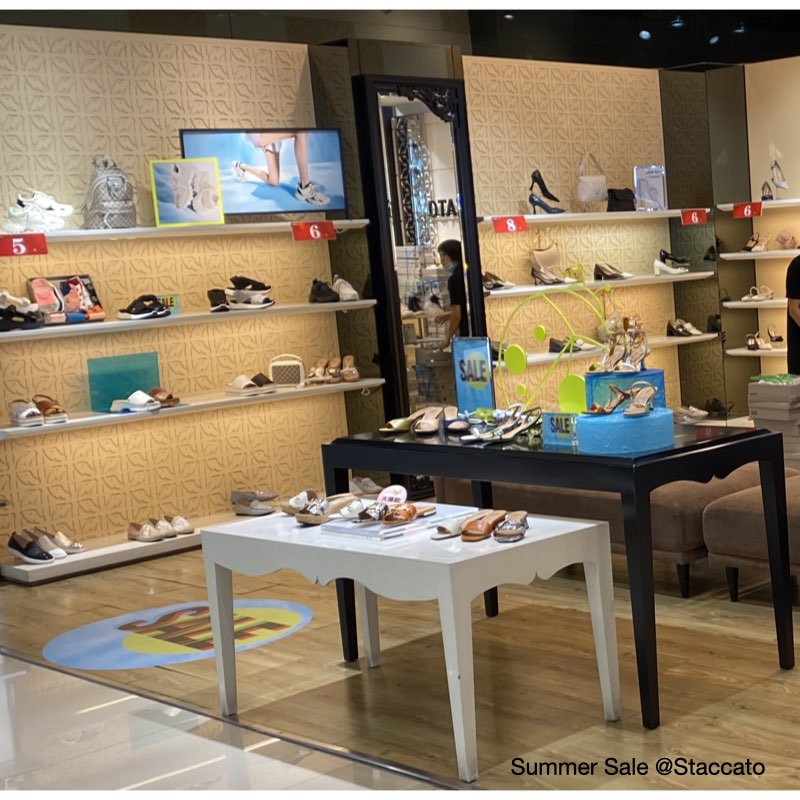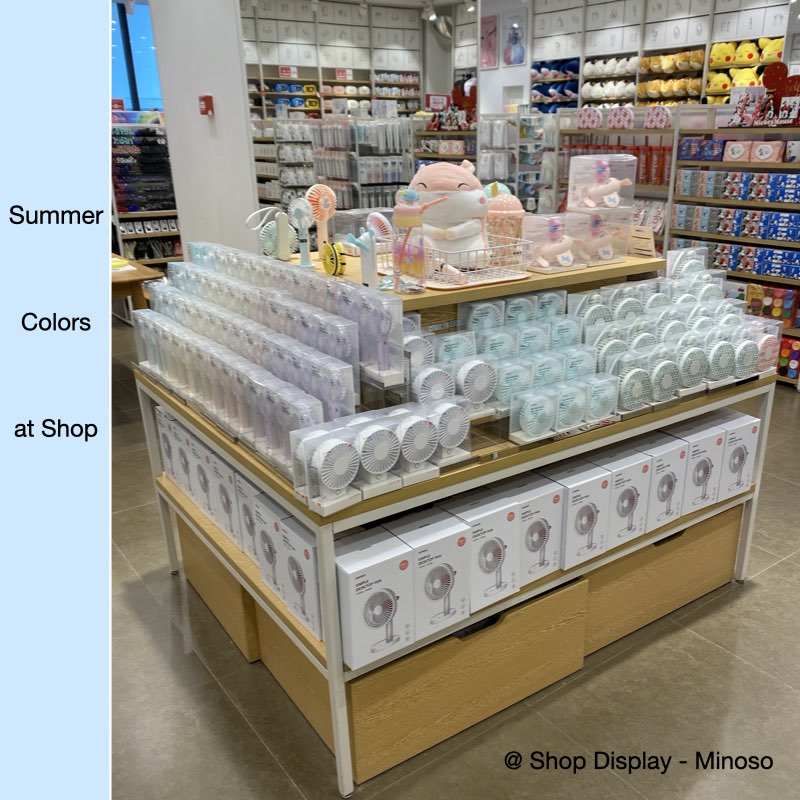 Compared to the colors of the Staccato women's shoe store, Miniso uses a softer pink hue. You see those summer explosions, such as: holding a small fan. The color of the small fan is mainly pink, including light blue, light green, pink purple, and white. These colors are soft and cool, giving people a cool feeling. For hot summer, they are a must-have for cooling down. It is also good to take it while shopping.