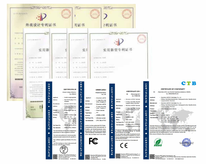 Our portable solar generator is our own research and development product, has 300Wh, 500Wh and 1000Wh for now. We have many innovative invention patents and the products meet the requirements of international safety regulations and the certification system is complete. At present, our solar portable power station have passed CE ROHS FCC PSE MSDS UN38.3,certificate of invention patent, certificate of utility model patent and certificate of design patent. And the products are tested by the national authoritative laboratory and the quality is reliable. Automated processing and production, use imported electronic materials and with strict quality inspection.