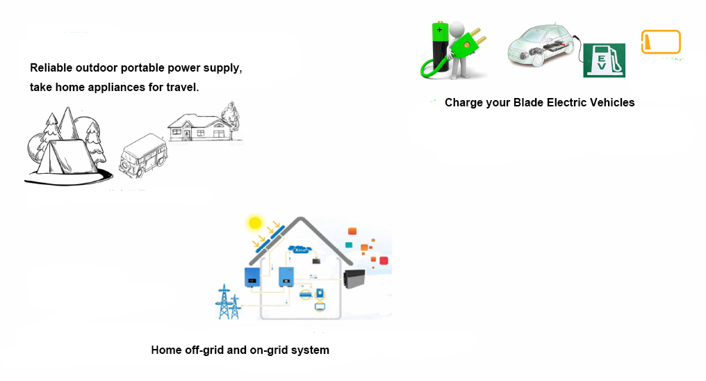 Our portable solar generator supports 3 charging methods,it can be recharged from the sun by connecting a compatible solar panel,or plug it into the wall or charged by plugging into your car 12V adapter. It’s a reliable power supply for small appliances and tools such as mobile phones, laptops, drones, small refrigerators, electric drills, computers and lights, etc., can be widely used in outdoor camping, travel, home off-grid and on-grid system like household electricity, raising and planting areas, remote mountainous areas, no electricity areas, islands, communication base stations and street lamps and other applications. It can also be used for Blade Electric Vehicles to solve the problem of battery on the road, help the driver to rescue and find suitable charging piles. Unlike other solar portable power station, our portable solar generator are with fanless design,which is quiet, clean, safe and with longer lifetime.