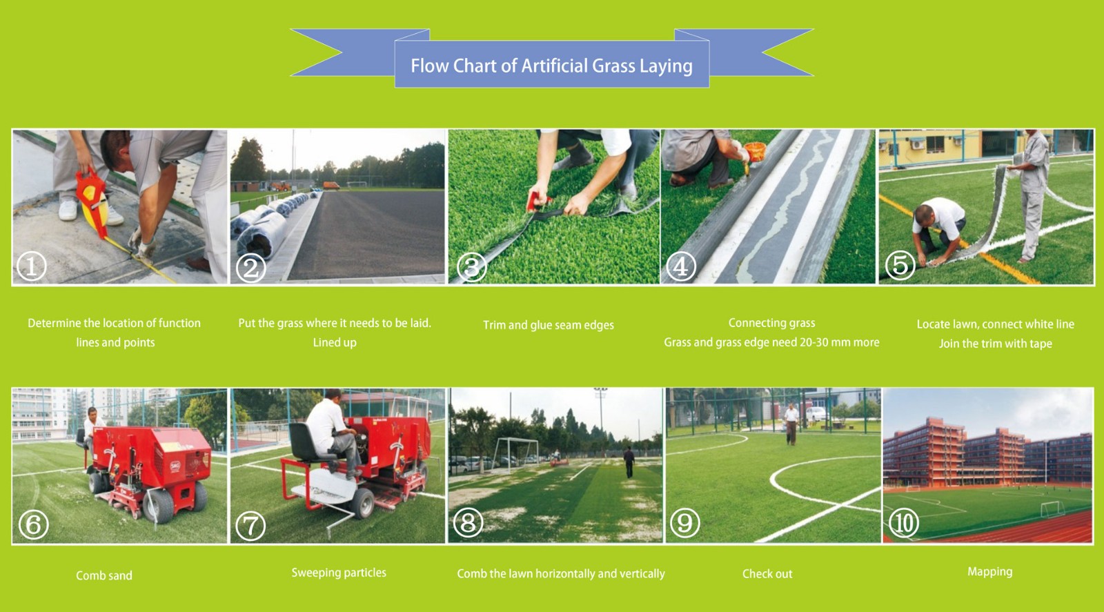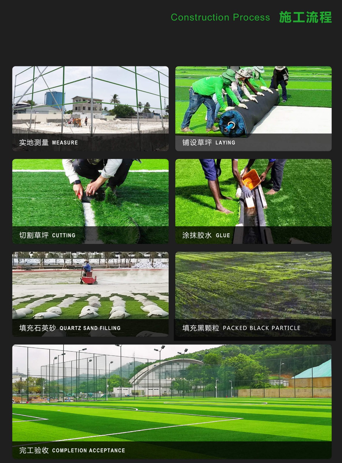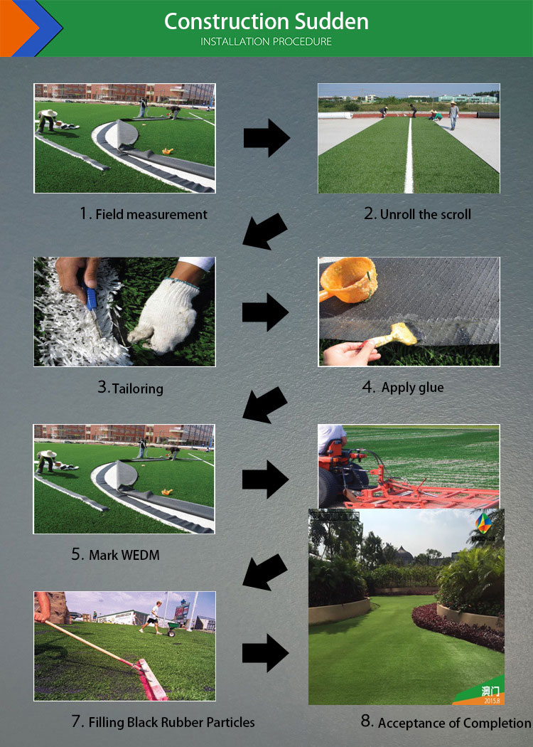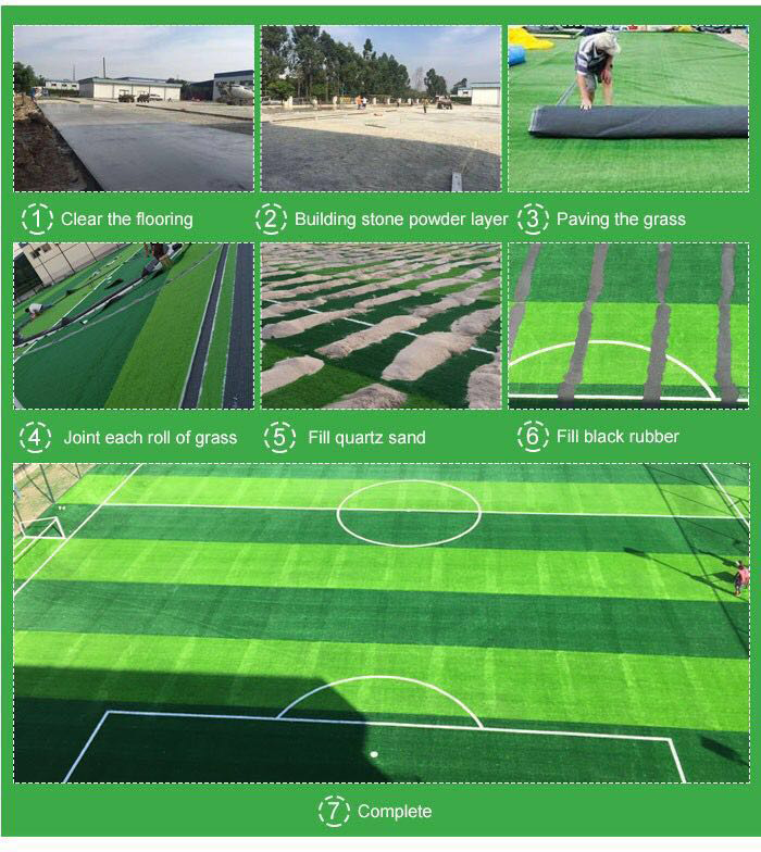 Measure → Clean the site → Pave the grass → Cutting the grass →Connect joint tape → Brush the glue →Combine the grass → Quartz Sand Filling → Packed Black Particle→Trim grass edge →Finished.