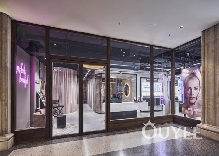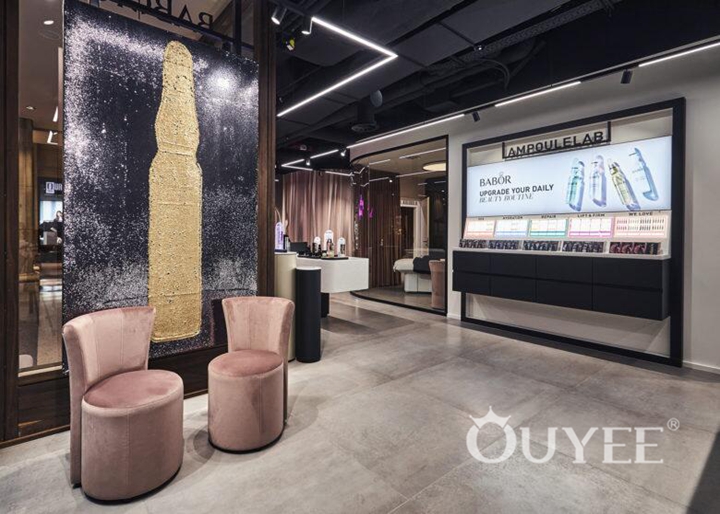 The store is devided into various zones. In the entrance area, the costumers are being welcomed with a modern functional look. The product placement is clearly arranged and the colour code is black and white with details in brass.The second zone has an even more cosy athmosphere The colour code is black, rose and a warm shade of grey with again details in brass.In the back zone, four treatment areas embrace the costumer with smooth textures and warm colours. Velvet curtains in rose compensate the black functional wall. An indirect light concept is completing the comfort zone. It’s a multi-billion dollar industry marked by sheer innovation and the boom has only just started. Barely known abroad, Dmil is one of the many players in the Korean beauty industry, and it does so as a beauty influencer management and content producer. Having garnered an abundance of knowledge through its online activities, the company decided to venture offline, creating its very first beauty boutique at Lotte World Mall in Seoul.