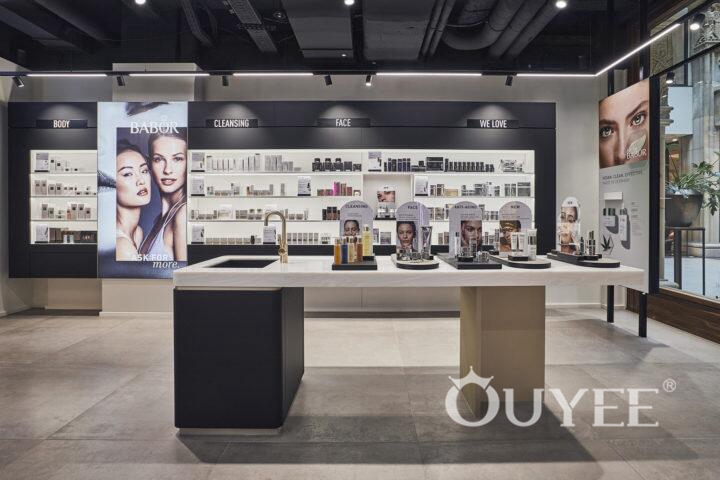 Built in 2014, it’s part of a prestigious complex which also includes the soaring Lotte World Tower, one of the world’s tallest buildings. The store, called dVine, is an extension of the company’s eponymous online domain, and specifically targets a millennial demographic. It occupies a 53 sqm.The outlines of the dVine store, captured by a swirling carpet and a meandering metal display, add a visual dynamic all its own. The aforementioned beauty squad’s videos are screened on-site.