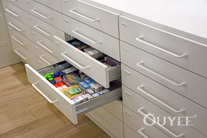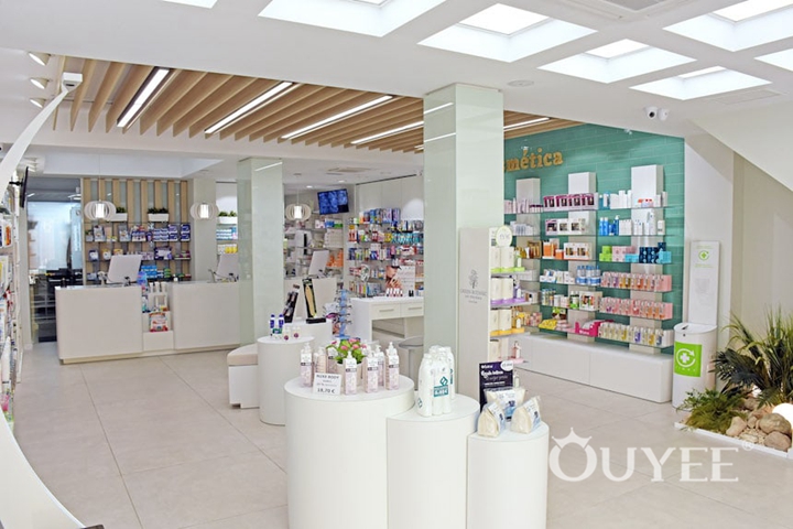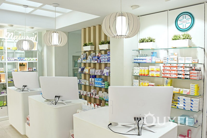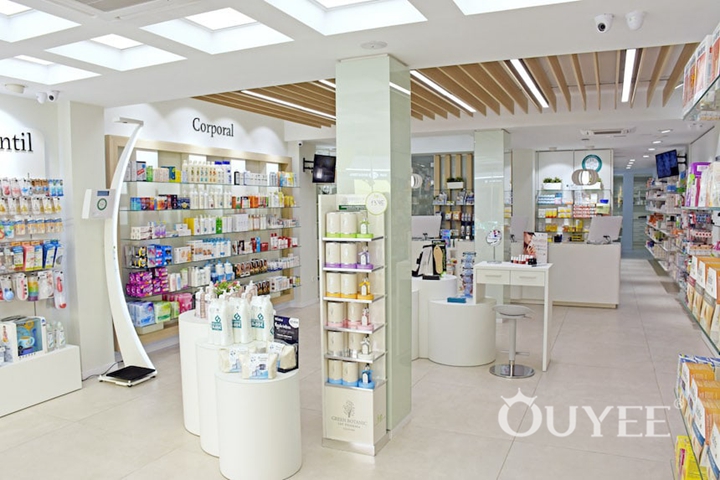 Many modern refits are also moving away from the traditional pharmacy greens and dark wood-finish fixtures towards white or light-finish clinical-looking fixtures, often made of glass. Bold, bright colour splashes or pastel variants of pharmacy blues and greens are often used to give a modern ‘twist’ to white, clinical backgrounds.