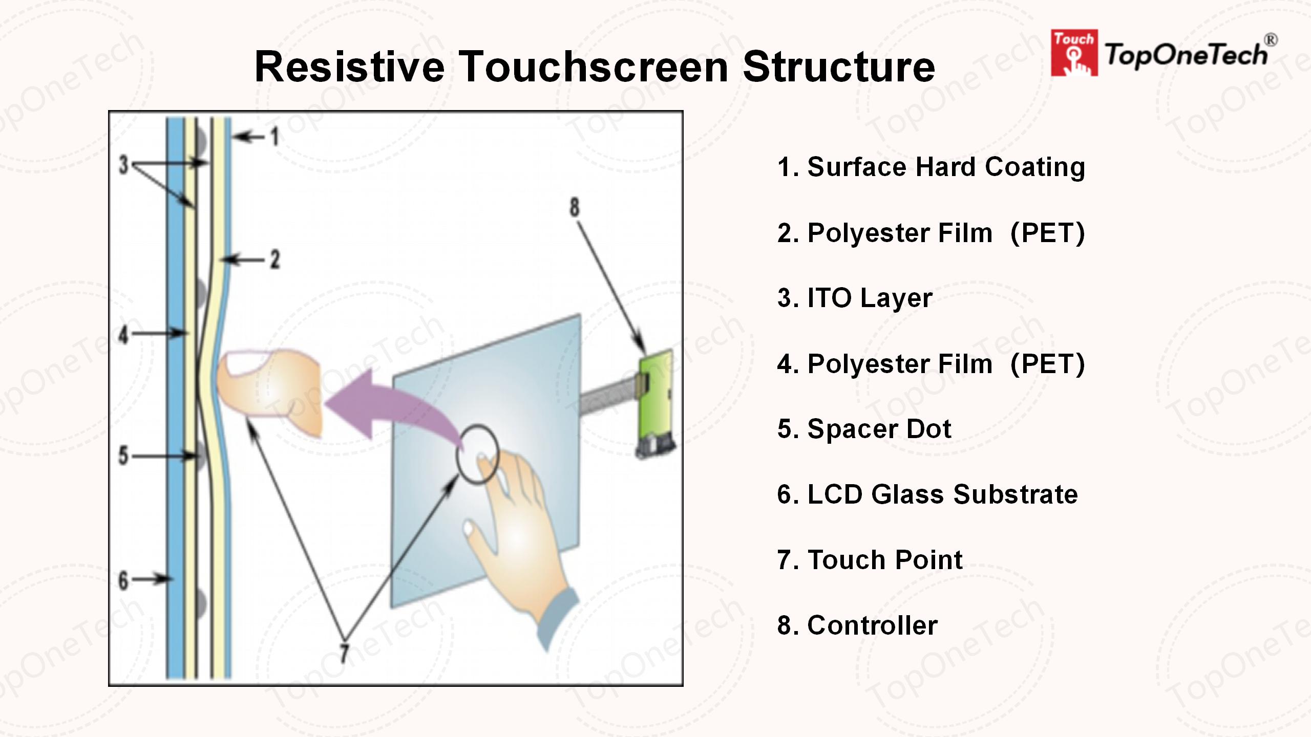 The surface touched by the finger is a hard coating to protect the underlying PET layer. The PET layer is a thin elastic PET film that bends downward when the surface is touched, and allows the two underlying ITO coatings to contact each other and connect the circuit at that point. Between the two ITO layers is a separation fulcrum about one thousandth of an inch thick that separates the two layers. At the bottom is a transparent hard bottom layer to support the above structure, usually glass or plastic.