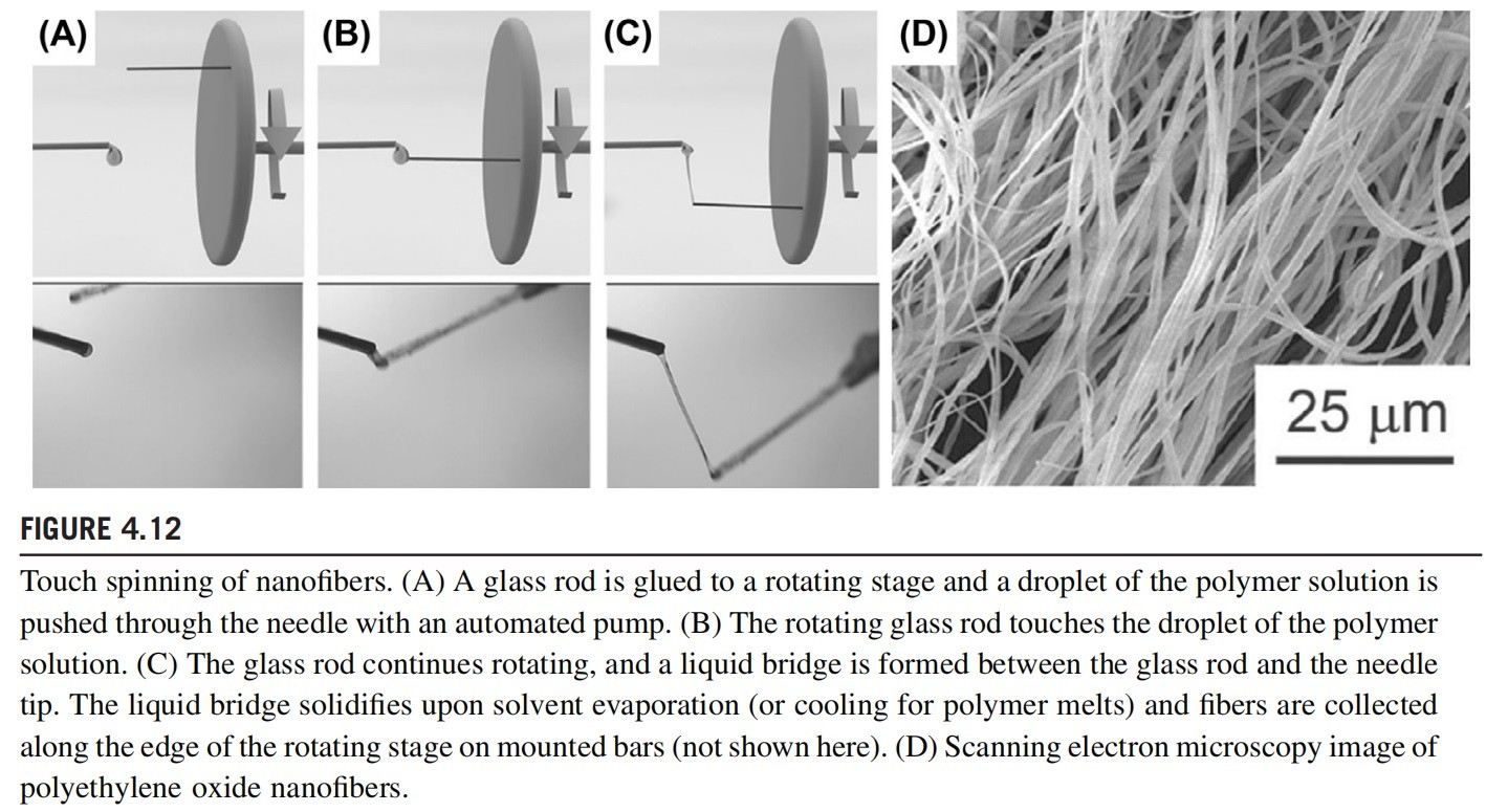 A further modification is a scalable method called touch spinning (Fig. 4.12). Nano/microfibers from 40 nm to 5 mm in diameter can be made by adjusting the rotational speed and polymer concentration (Tokarev et al., 2015). A glass rod (0.3 mm to a few millimeters in diameter) is glued to a rotating stage. A polymer solution is supplied, for example, from the needle of a syringe pump that faces the glass rod. The distance between the droplet of polymer solution and the tip of the glass rod is adjusted so that the glass rod contacts the polymer droplet as it rotates. Following the initial “touch,” the polymer droplet forms a liquid bridge. As the stage rotates, the bridge stretches and fiber length increases, with the diameter decreasing owing to mass conservation. Polyethylene nanofibers can be made by this method.