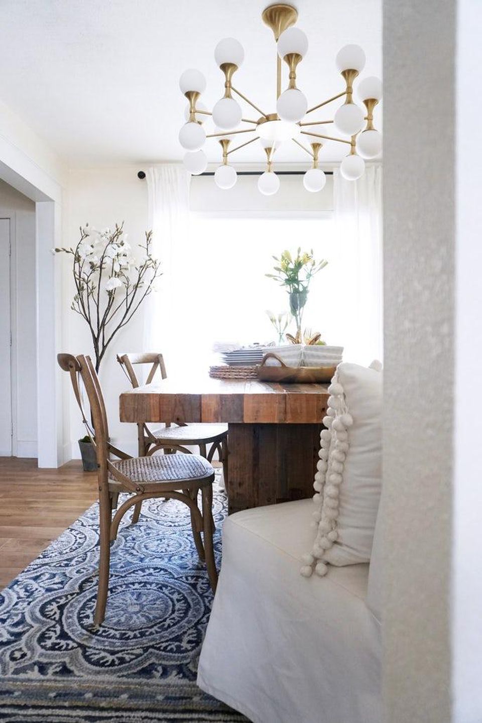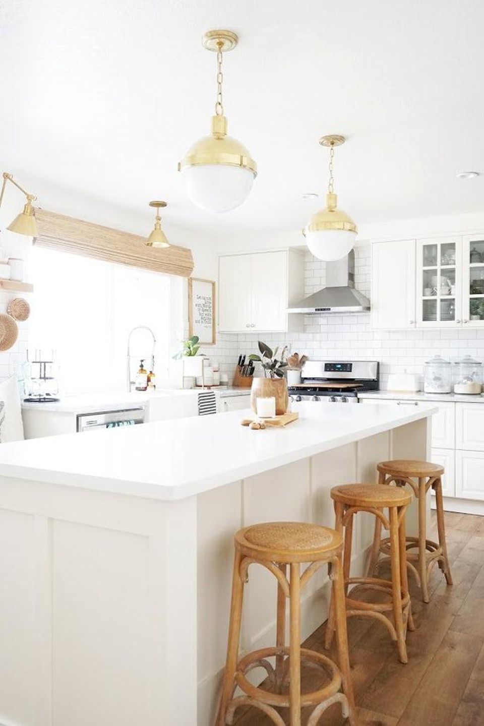 在这个清爽的白色厨房里,吊灯显得格外显眼。