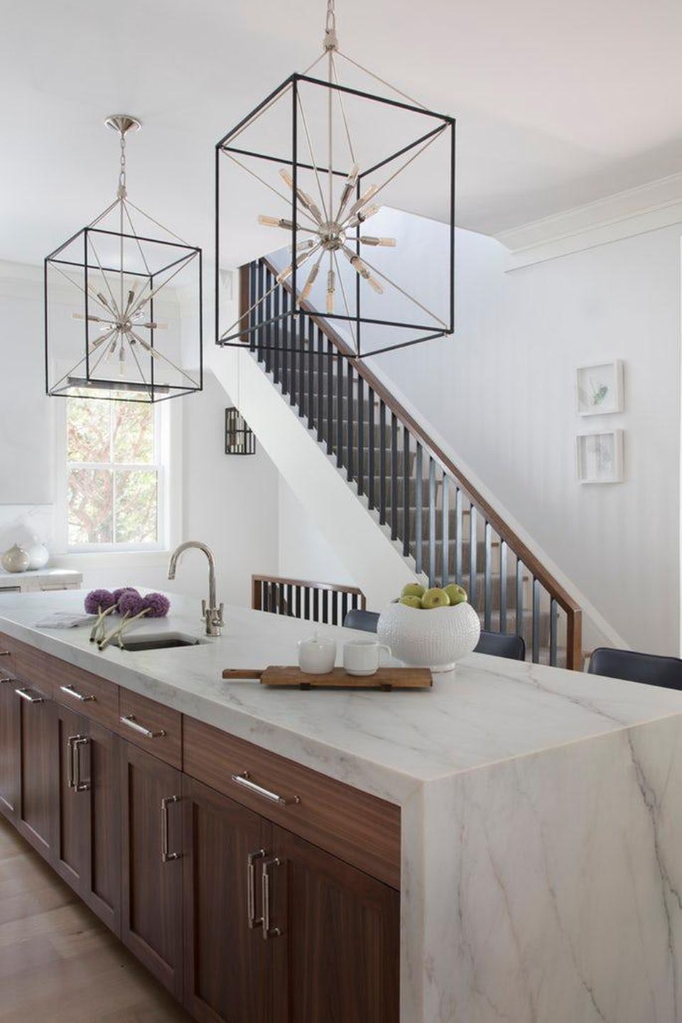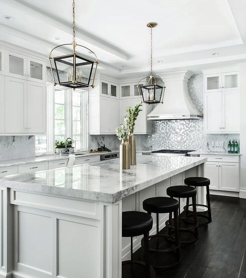 Select the right lighting according to the size of Space and Counter. Many islands have two or three small pendants, but some require as many as four small lights (or less headlights).In this case, two large chandeliers perfectly cover a long marble island.