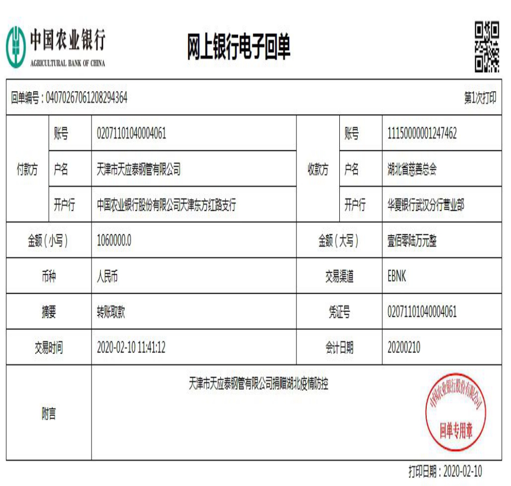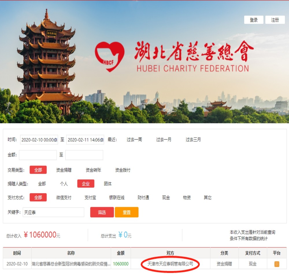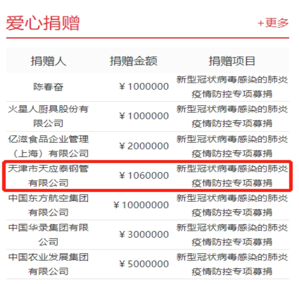 The board of directors and all employees of Tianjin Tianyingtai Steel Pipe Co., Ltd. (hereinafter referred to as "TYT Steel Pipe"), who has always been concerned about Hubei compatriots and partners, are always deeply concerned about the severity of the epidemic and the shortage of medical supplies. It is incumbent on us to fight against the epidemic, and it is imperative to help Hubei. TYT Steel Pipe immediately launched an epidemic support operation, organized employees to make donations in love, and contributed their own strength to win the epidemic prevention and control fight.