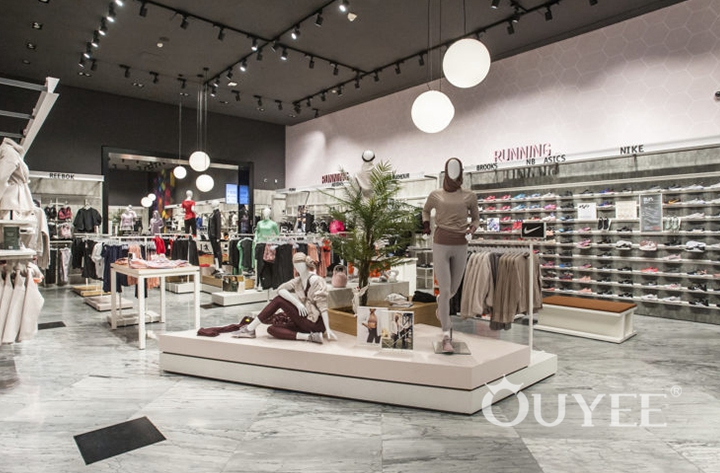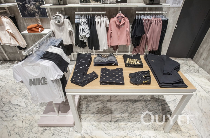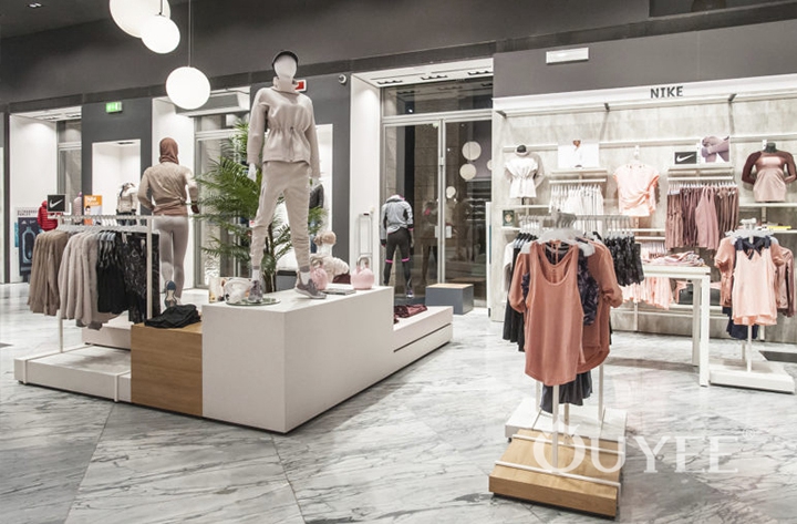 Shopping experience in a genuine atmosphere.Diversely arranged surfaces give costumers room to explore: Curated isles with seat possibilities and room-in-room systems structure the single levels. Tables, shelves, cubes, parallel bars, poles – the team of blocher partners designed varied possibilities to present fashion.